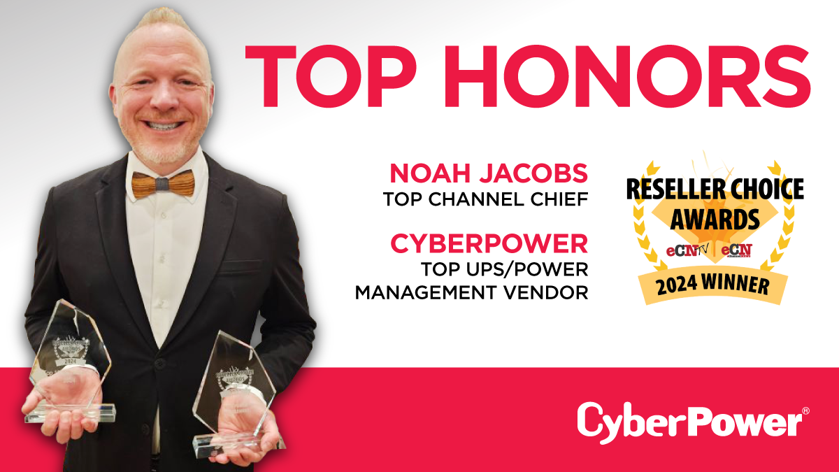 CyberPower was named Top UPS/Power Management Vendor for 2024 by TechnoPlanet/eChannelNews (eCN). Each year, eCN recognizes the premier organizations in the Canadian IT Industry. Top vendors and distributors were selected by resellers throughout Canada and were recognized at an awards gala on February 6 in Toronto. CyberPower’s very own Noah Jacobs was in attendance to accept the award and was also selected as a Top Channel Chief for the second year in a row!
