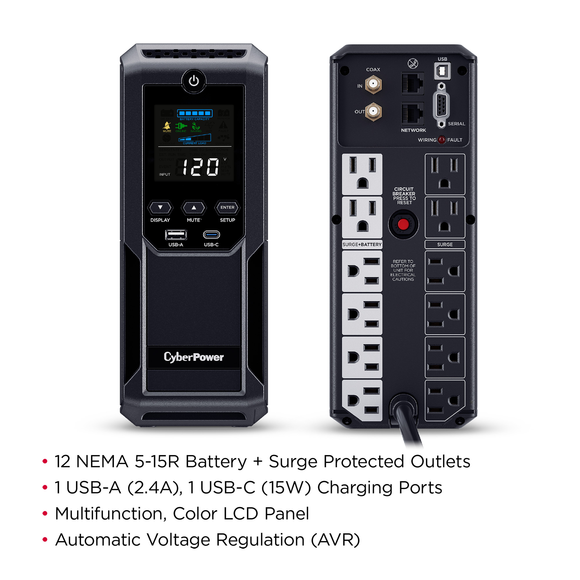 AVR increases the AC power and maintains a safe voltage level without switching to battery mode and conserving battery life. - Multifunction, Color LCD