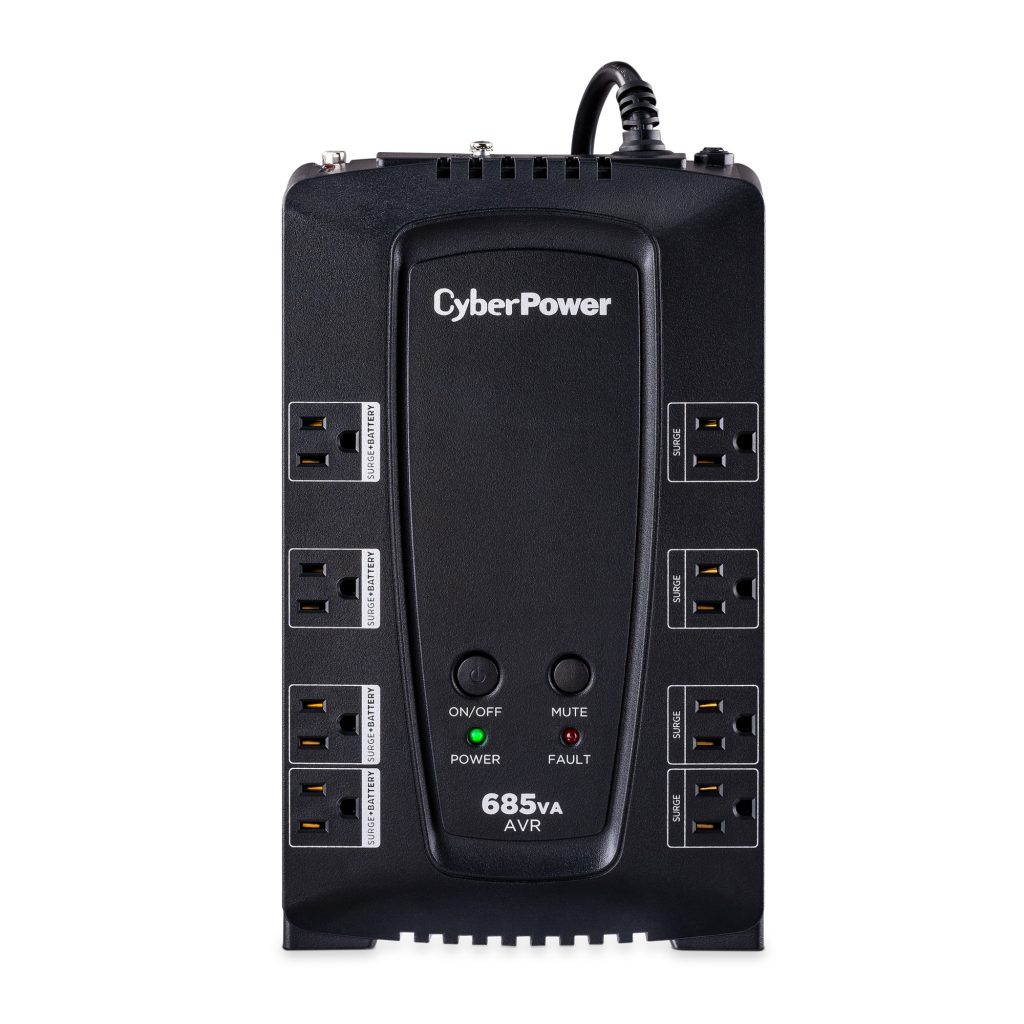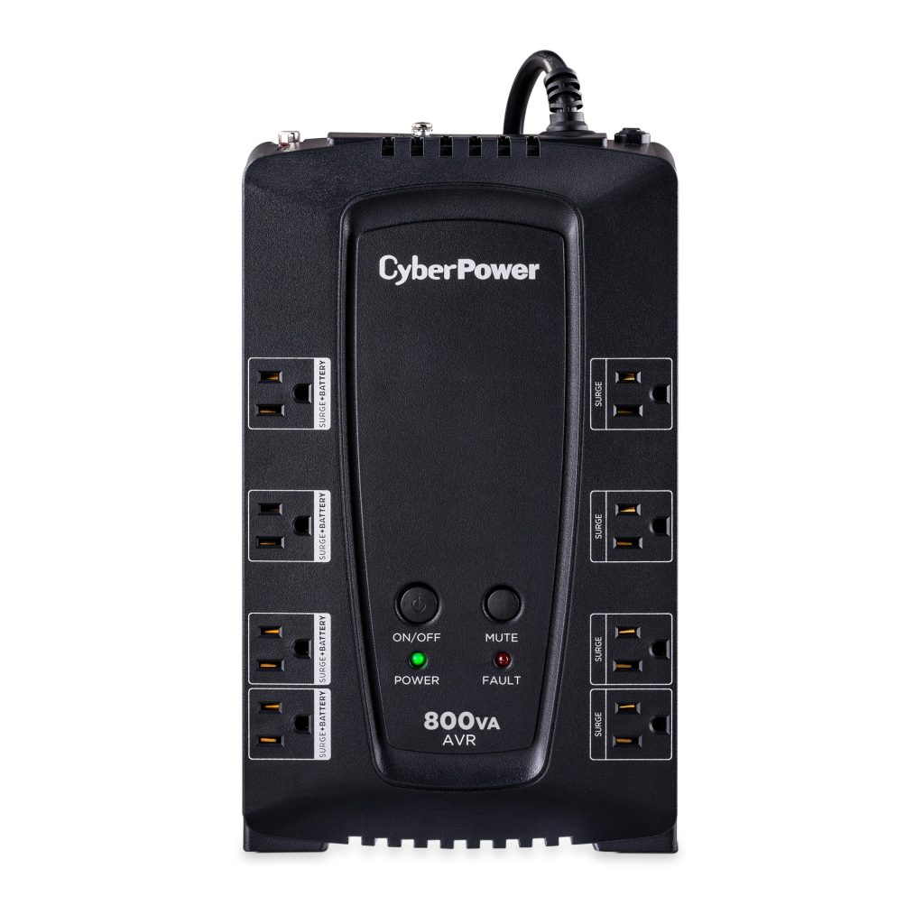AVR UPS systems from CyberPower, designed with line interactive topology, offer guaranteed power protection for desktop computers, workstations, personal electronics, and home networking/VoIP. They provide simulated sine wave battery backup power during outages, maintain steady voltage during brownouts, and offer surge protection against over voltages and power spikes. Features include Automatic Voltage Regulation (AVR), energy-saving GreenPower UPS™ design, data line protection, and management software to easily control and monitor your UPS.