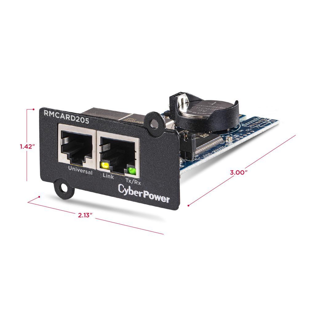 A full-featured network management card, the CyberPower RMCARD205TAA remotely manages, monitors and controls select CyberPower UPS systems and ATS PDUs via a standard web browser, command line interface (CLI), SNMP or network management system (NMS). Especially suited to enterprise installations, the RMCARD205TAA provides scheduling for UPS shutdown, startup, and rebooting, along with event action settings, event logging, status recording, and automatic event notifications via email, SMS, SNMP traps, or Syslog. PowerPanel® Business Edition Client software protects servers and workstations from data loss due to power failure by initiating auto-shutdown command from a UPS when a power loss event occurs.