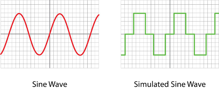 Simulated sine wave output: An approximated sine wave output waveform. It uses pulse wave modulation to generate a stepped, approximated sine wave to supply more cost-effective battery backup power for equipment that does not require sine wave output. The technology used to produce this type of power output is less expensive to manufacture and is common in standby and line interactive UPS systems.