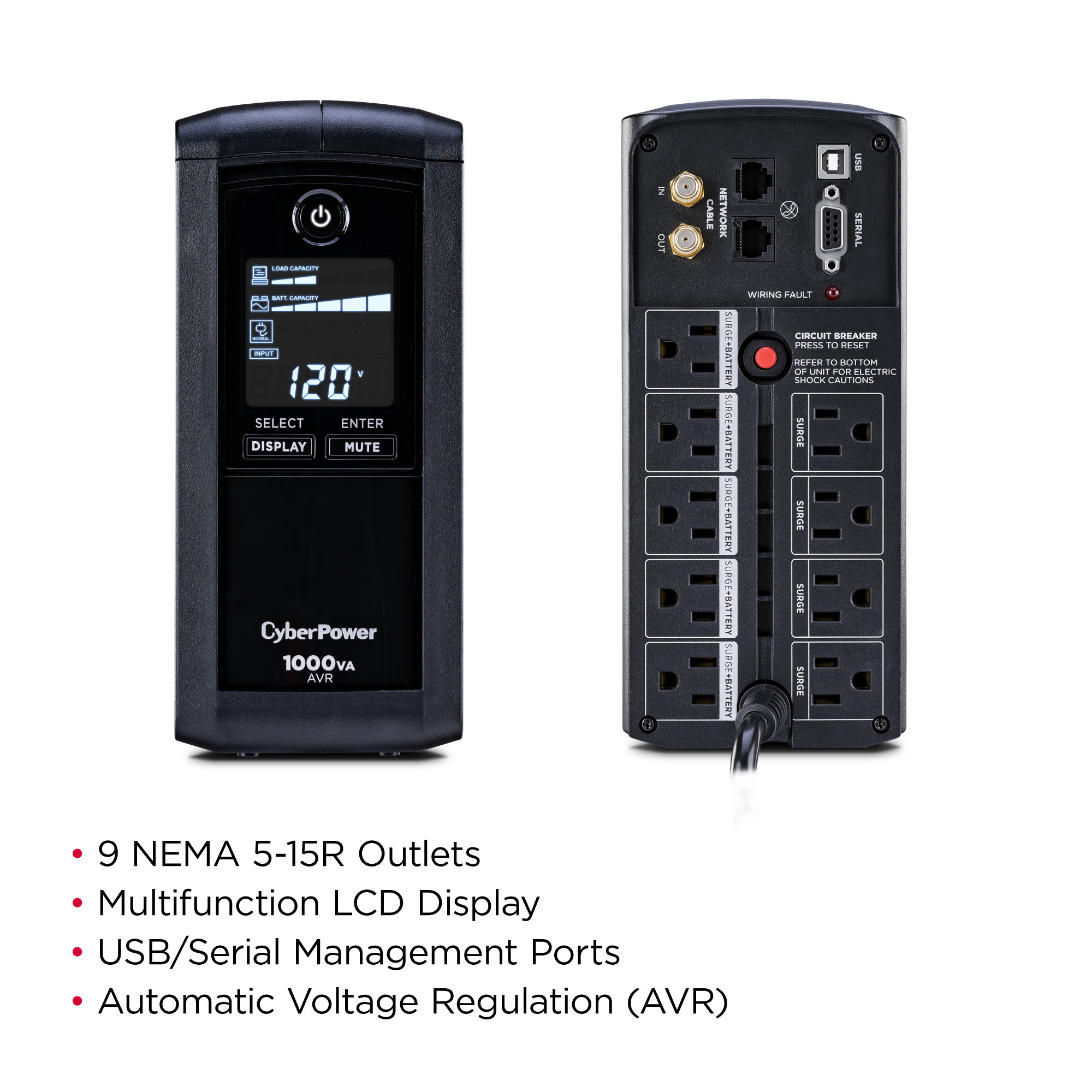 AVR increases the AC power and maintains a safe voltage level without switching to battery mode and conserving battery life. - Multifunction LCD