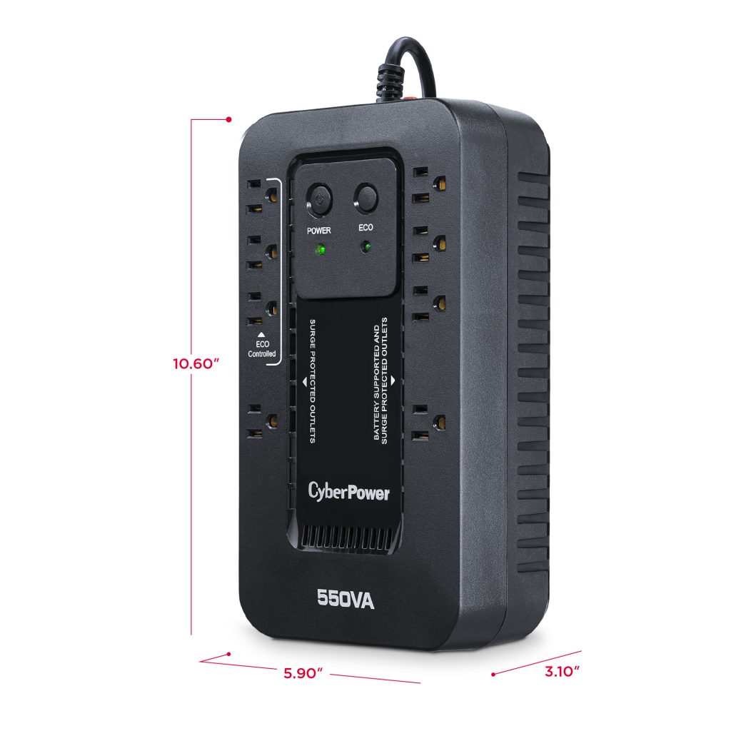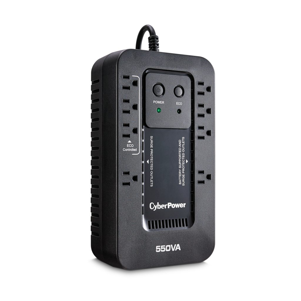 A compact UPS with standby topology, the CyberPower Ecologic EC550G provides battery backup (using simulated sine wave output) and surge protection for desktop computers, workstations, networking devices, and home entertainment systems. During power interruptions, the EC550G offers reliable power protection and battery backup. When the battery backup detects that the computer is off or in sleep mode, computer peripherals connected to the ECO Mode, surge protected outlets will be automatically turned off, reducing power usage and lowering energy costs (USB connection required). The EC550G comes with a three-year warranty (including coverage of batteries) and a $100,000 Connected Equipment Guarantee.