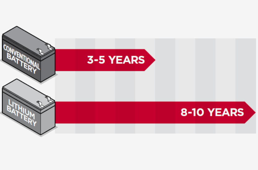 Lithium batteries offer eight to ten years of battery life — more than double the life of conventional UPS batteries.
