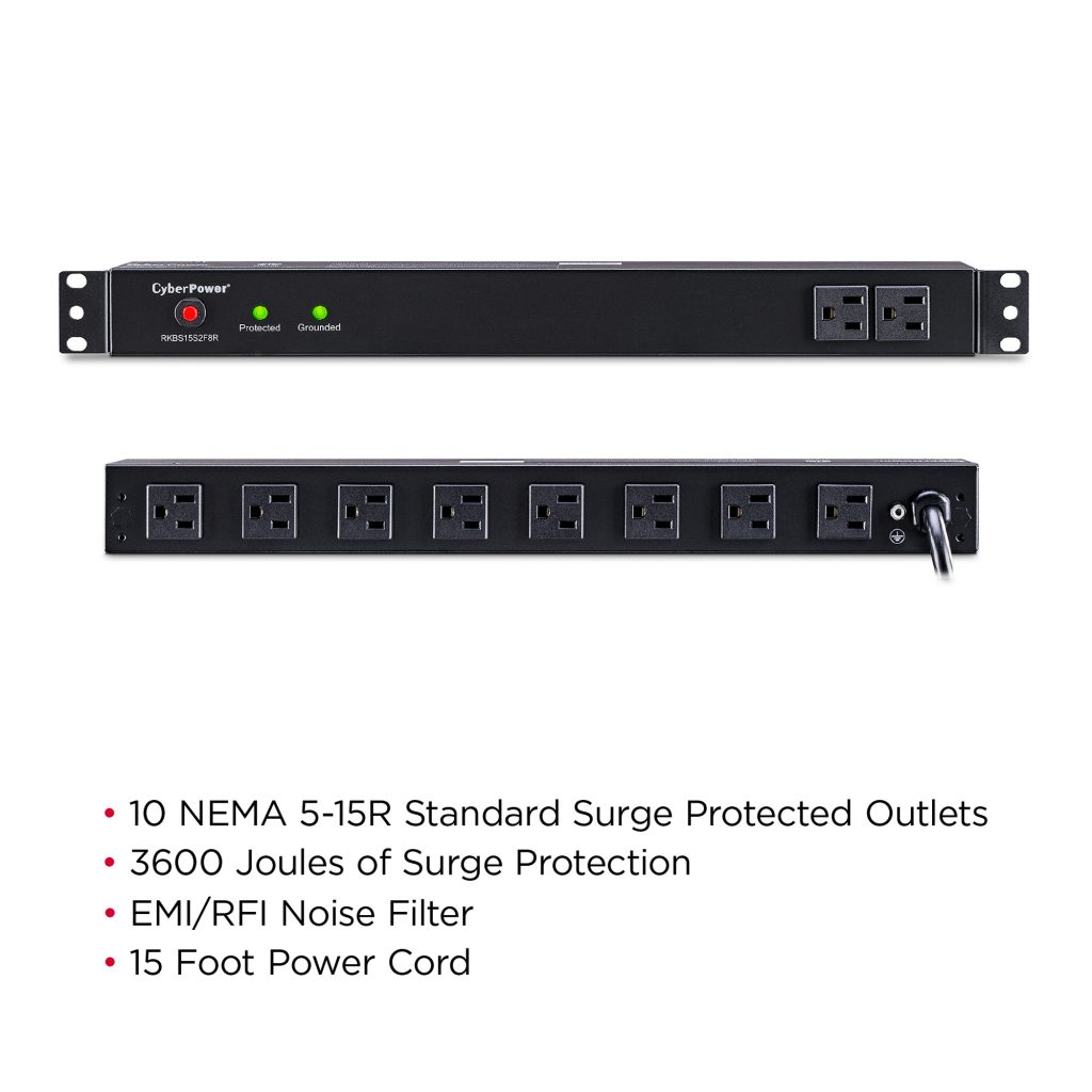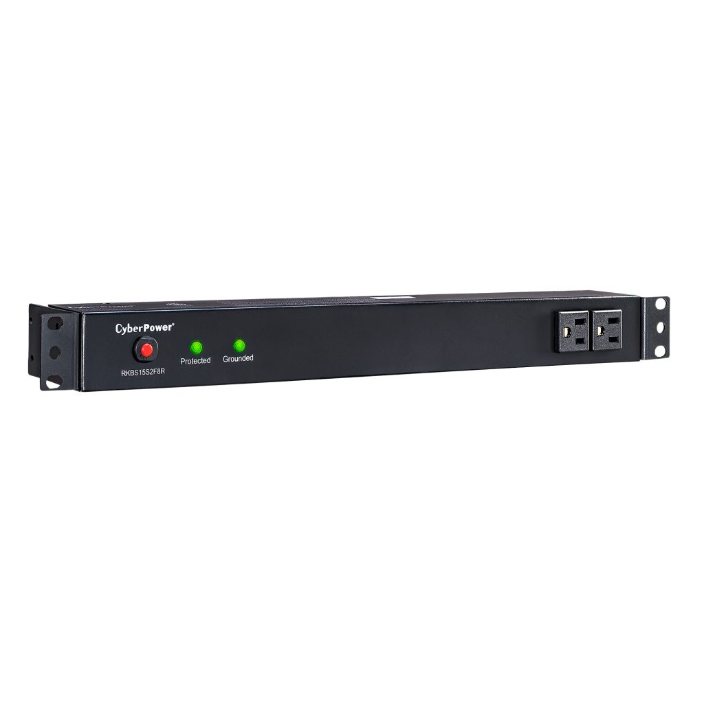 Engineered for the most demanding applications, the professional-grade Rackbar™ Surge Protector RKBS15S2F8R from CyberPower safeguards systems and networking equipment by absorbing spikes in energy caused by storms and electrical power surges. Designed for network environments, the RKBS15S2F8R also performs superbly for home office use, providing 3600 joules of protection, 15-Amp electrical capacity with circuit breaker, and 10 surge-protected outlets (2 front, 8 rear). Industrial-grade metal housing keeps this Rackbar performing flawlessly. Two sets of mounting brackets provide flexible installation options: 1U rackmount (19 in.); 0U vertical rackmount and under-counter configurations.