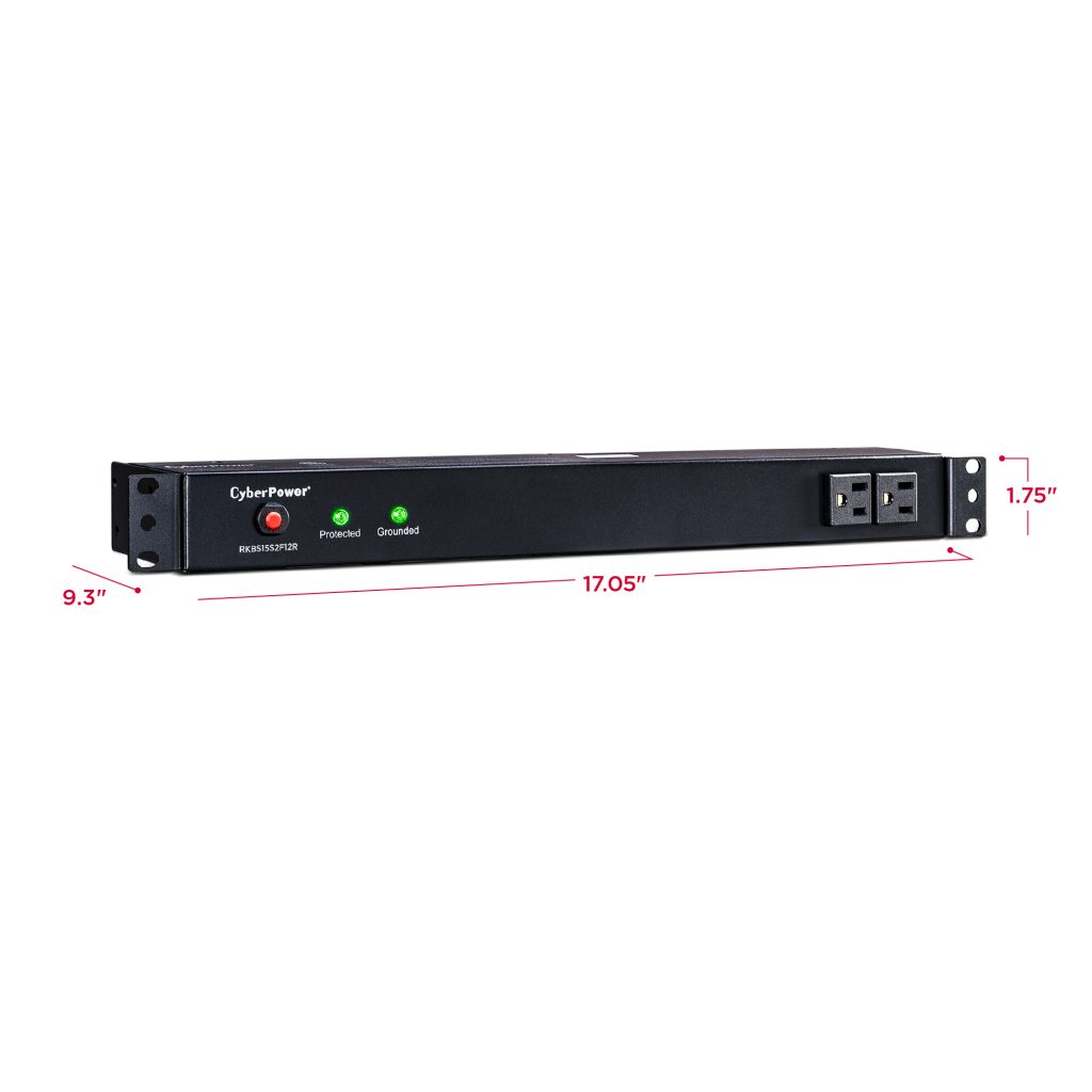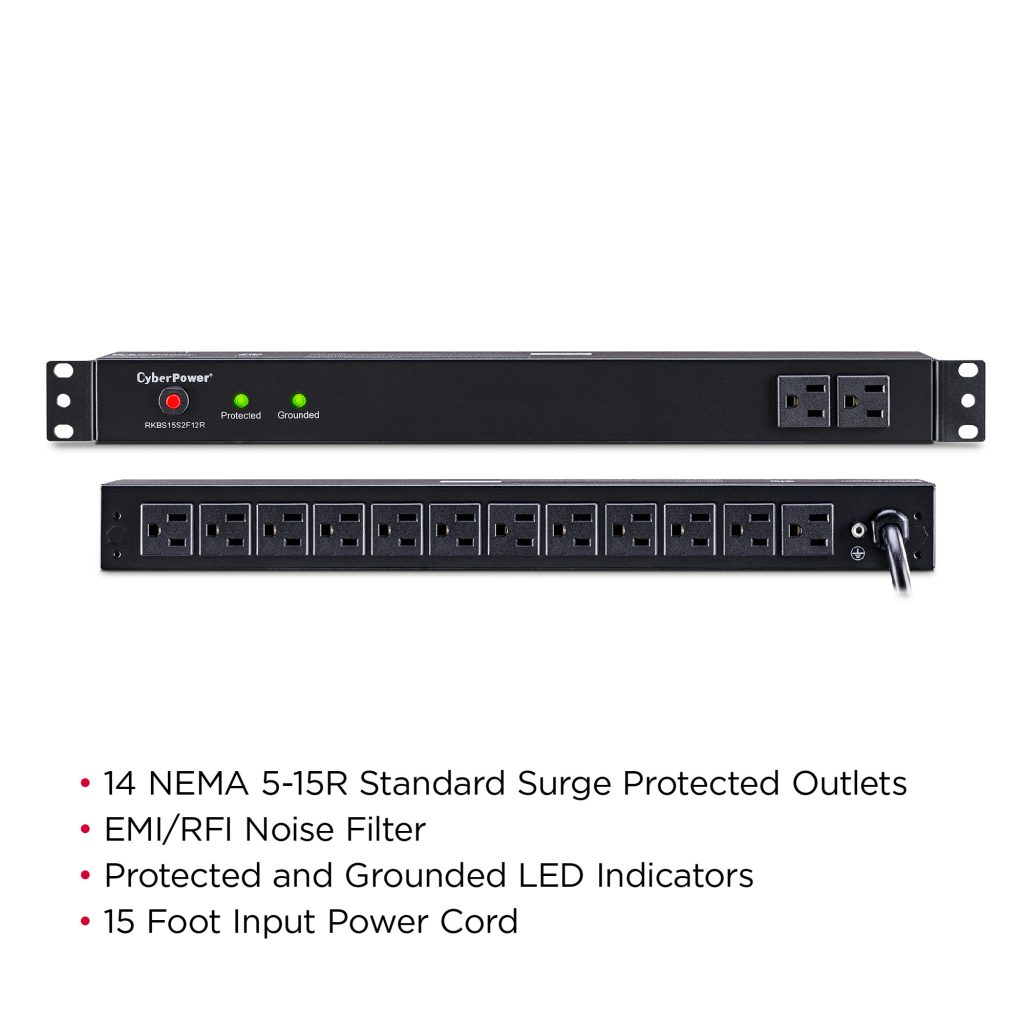 Engineered for the most demanding applications, the professional-grade Rackbar™ Surge Protector RKBS15S2F12R from CyberPower safeguards systems and networking equipment by absorbing spikes in energy caused by storms and electrical power surges. Designed for network environments, the RKBS15S2F12R also performs superbly for home office use, providing 3600 joules of protection, 15-Amp electrical capacity with circuit breaker, and 14 surge-protected outlets (2 front, 12 rear).