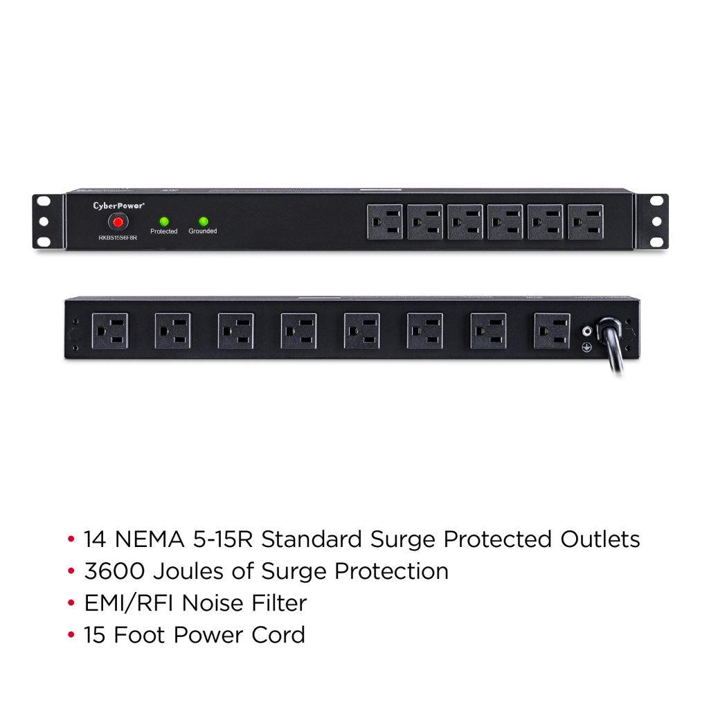 Engineered for the most demanding applications, the professional-grade Rackbar™ Surge Protector RKBS15S6F8R from CyberPower safeguards systems and networking equipment by absorbing spikes in energy caused by storms and electrical power surges. Designed for network environments, the RKBS15S6F8R also performs superbly for home office use, providing 3600 joules of protection, 15-Amp electrical capacity with circuit breaker, and 14 surge-protected outlets (6 front, 8 rear). Industrial-grade metal housing keeps this Rackbar performing flawlessly. Two sets of mounting brackets provide flexible installation options: 1U rackmount (19 in.); 0U vertical rackmount and under-counter configurations.