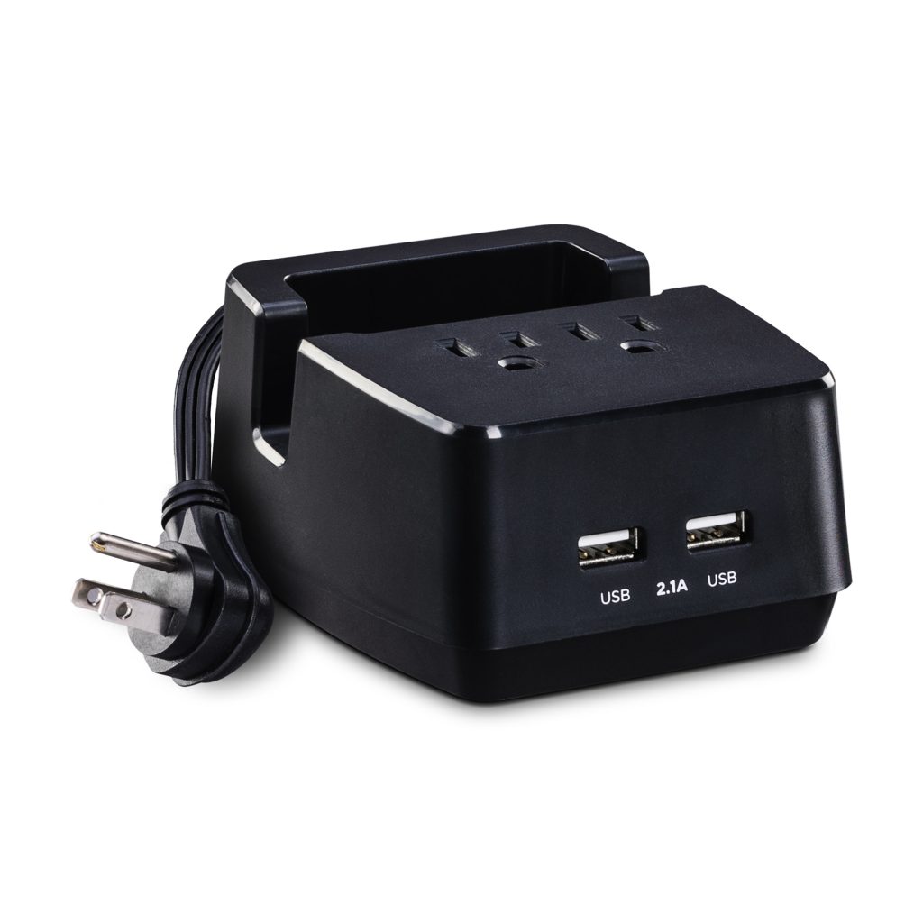 With two USB charge ports (2.1 Amp shared) and two grounded, three-prong outlets, the CyberPower PS205U Dual USB Power Station provides fast charging power in a compact model. The PS205U fits easily on a desk, end table, or nightstand. The two USB ports offer power to swiftly recharge tablets and smartphones. The PS205U comes with a heavy-duty power cord (5 ft.) and a one-year limited warranty.