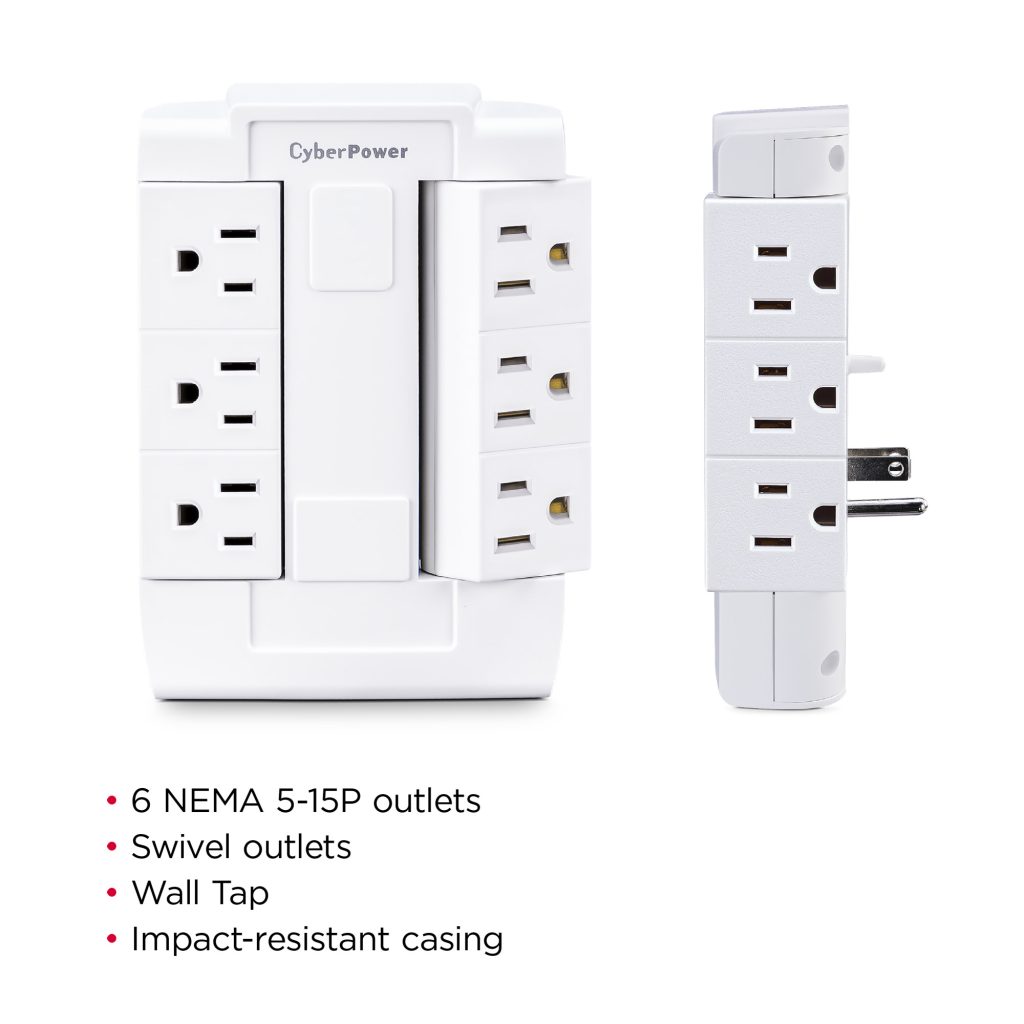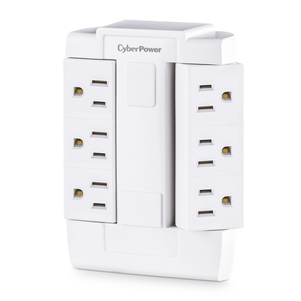 The GT600P Swivel Wall Tap from CyberPower expands two grounded outlets into six grounded outlets and rotates for easy access. The Swivel Wall Tap features six standard spaced outlets in two columns of three outlets for versatile arrangement of plugs. Conveniently designed to fit behind furniture and appliances, this wall tap is ideal for small electronics, chargers, and household fixtures such as lamps.