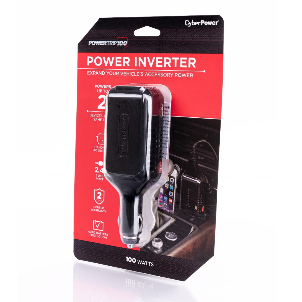 The AC Power Inverter model CPS100PBU from CyberPower converts your vehicle's DC power to household AC power to rapidly charge and operate devices which use 75 watts of power continuously, up to 100W of peak power (10 seconds maximum). It also provides one 2.4A USB-A output for mobile device charging, and automatic shutdown to safeguard your vehicle's battery from dropping below normal values necessary for start-up. A two-year limited warranty comes with the CPS100PBU.