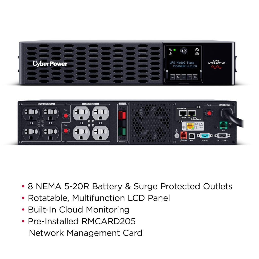 The PR2000RTXL2UTAA is a Smart App Sinewave rack/tower convertible UPS with line-interactive topology, surge protection, and battery backup. CyberPower’s Smart App Sinewave series has sine wave output to eliminate power gaps that can be detected by sensitive equipment and cause unexpected shutdowns.