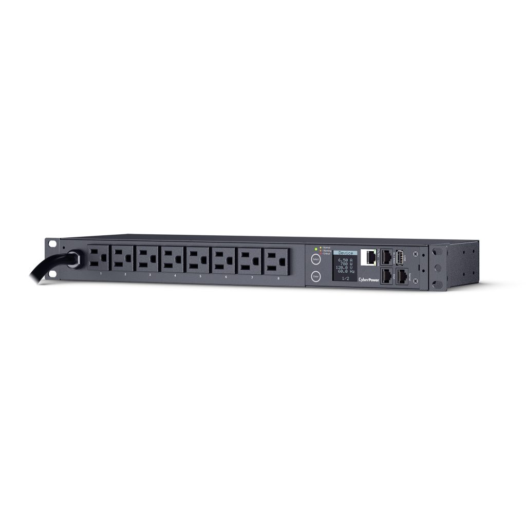 The PDU71001 supports inputs between 100-120V and includes 8 NEMA 5-15R outlets. Other features include a rack mount design (1U), built-in web interface (RJ-45 ethernet connection), interactive digital display and power event notifications. The CyberPower PDU71001 is protected by a three-year limited warranty.