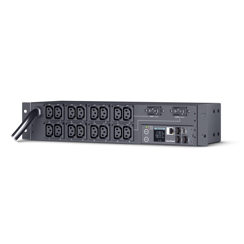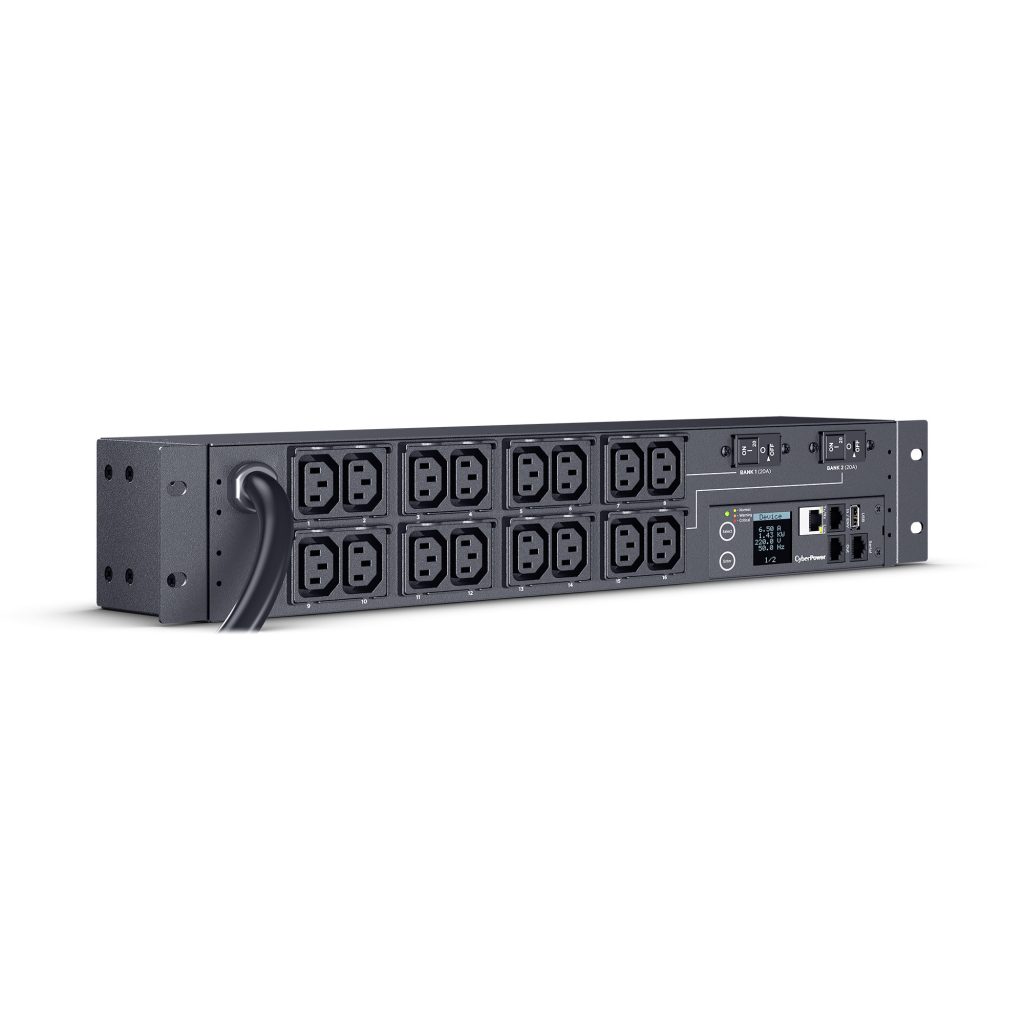 The PDU71007 supports inputs between 200-240V and includes 16 IEC-320 C13 outlets. Other features include a rack mount design (2U), built-in web interface (RJ-45 ethernet connection), interactive digital display and power event notifications. The CyberPower PDU71007 is protected by a three-year limited warranty.