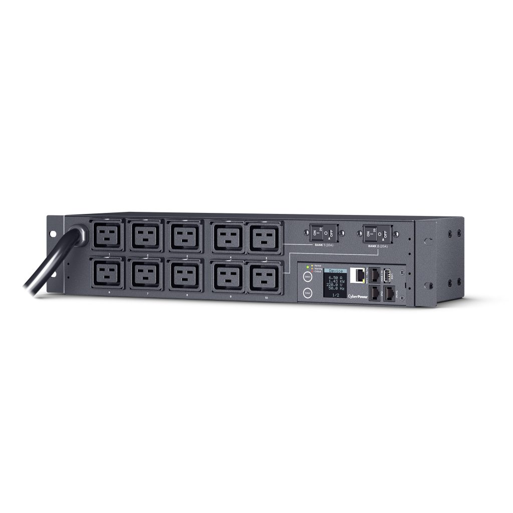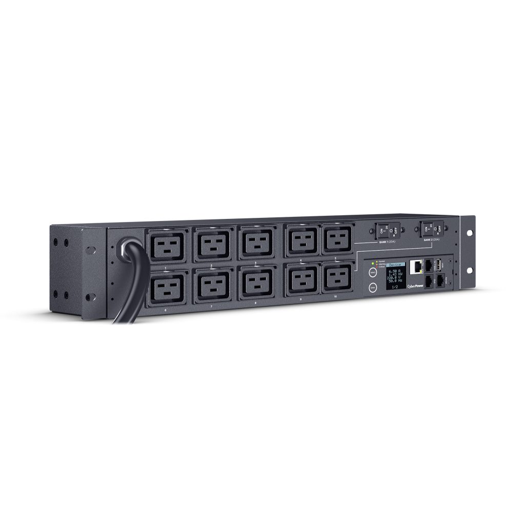 The PDU71009 supports inputs between 200-240V and includes 10 IEC-320 C19 outlets. Other features include a rack mount design (2U), built-in web interface (RJ-45 ethernet connection), interactive digital display and power event notifications. The CyberPower PDU71009 is protected by a three-year limited warranty.