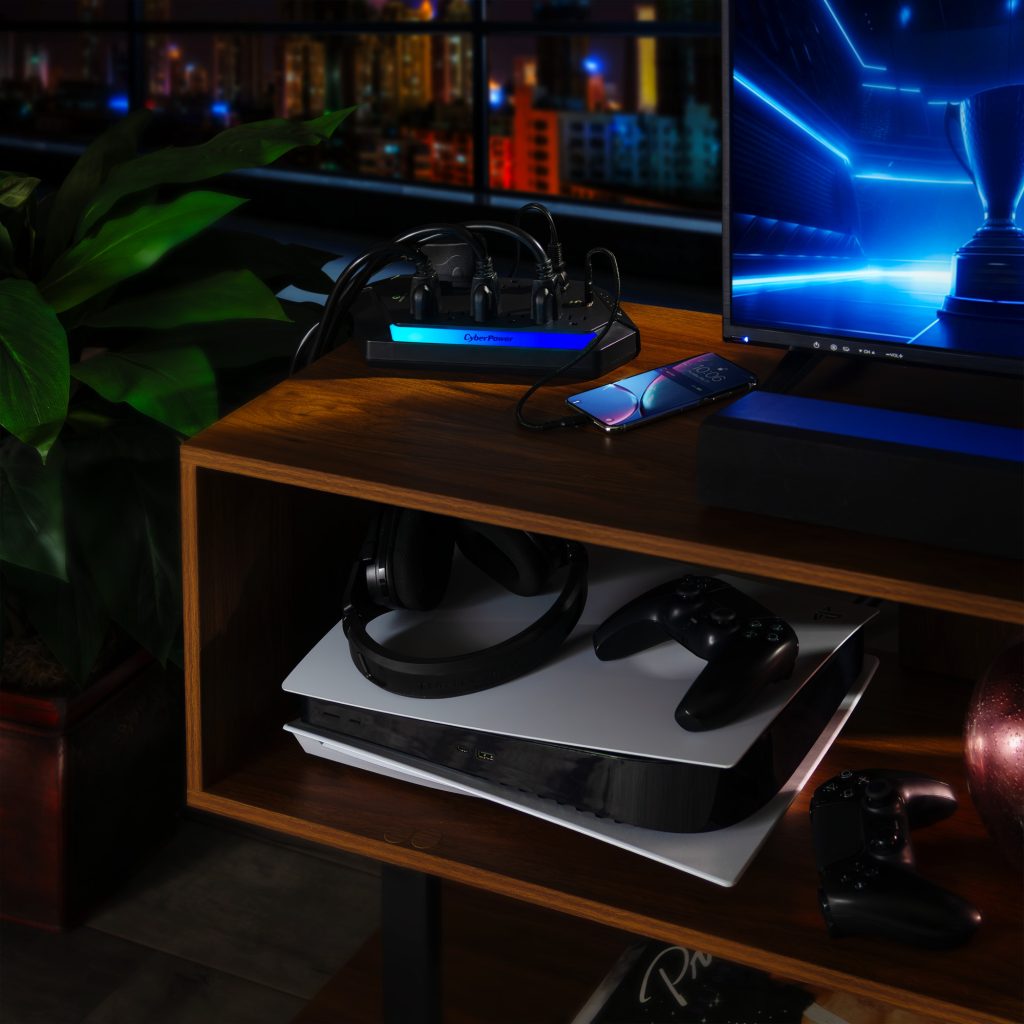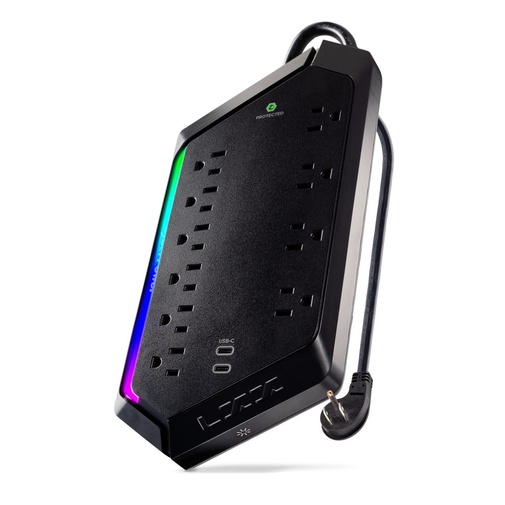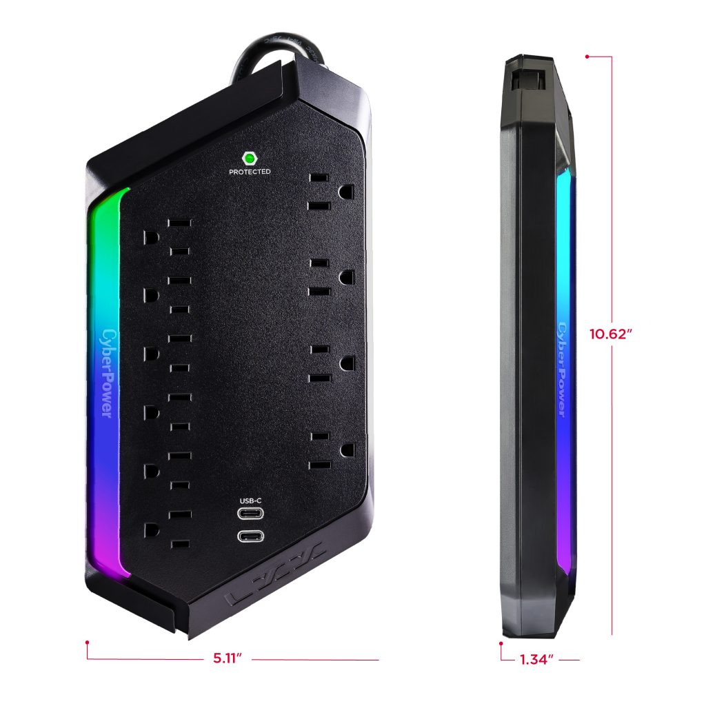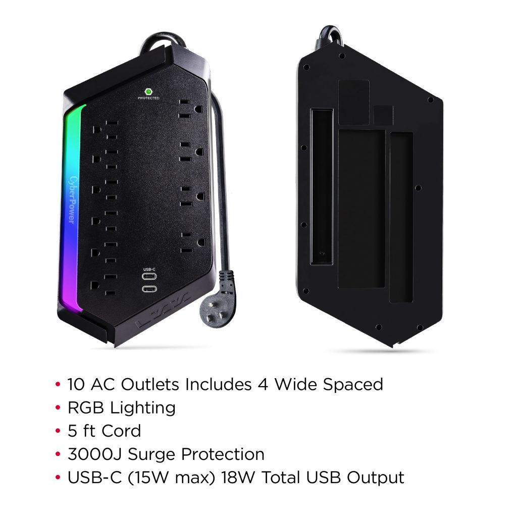 Level up your defense with the CyberPower GXS1005C2 Surge Protector – built for gamers who don’t mess around. Packing a whopping 3000 joules of protection, it shields your battle station from power spikes, surges, and the chaos of the grid. Whether you’re running raids on your console or racking up kills on your PC, your gear stays locked and loaded. With 10 total outlets (including 4 wide-spaced for chunky plugs), a 5-foot cord, and dual USB-C ports for fast charging, you can power your rig, dual monitors, charging docks, VR base stations, and still have room to spare—no more playing outlet Tetris. And the customizable RGB light bar? It syncs with your setup so your surge protector doesn’t just protect—it flexes. Backed by a 1-year warranty and a $300,000 Connected Equipment Guarantee, the GXS1005C2 is your shield against power chaos. Defend your gear. Light up your loadout. Stay in the game.
