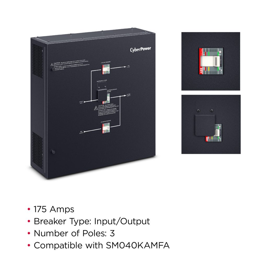 The CyberPower MBS175D5B 3-Phase Maintenance Bypass Switch provides convenience and safety for maintenance bypass applications. Maintenance bypass panel for complete isolation of the UPS during service operations. Includes a One-Year Limited Warranty.