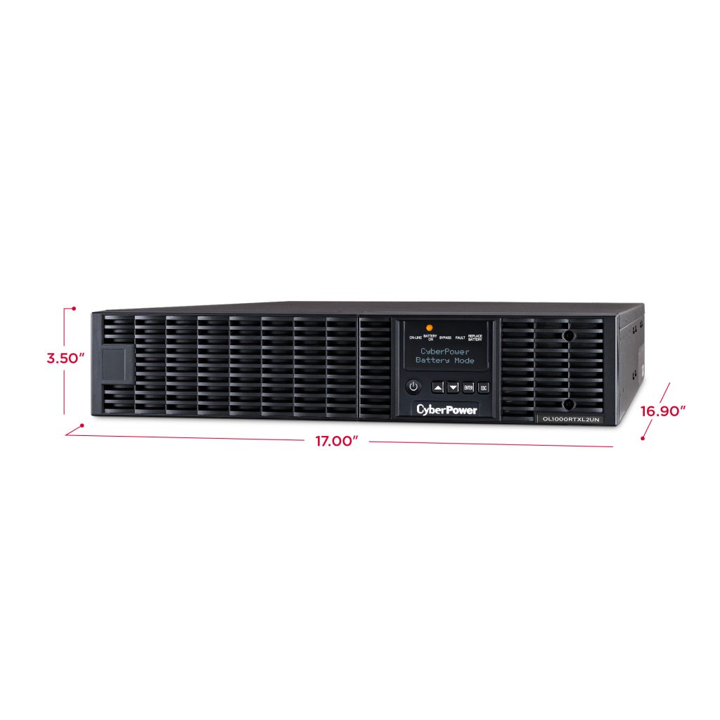 The CyberPower OL1000RTXL2UN is a rack/tower UPS with double conversion topology. It provides sine wave output to critical applications and equipment that require seamless power correction. The Extended Battery Module (EBM) expands runtime, and Fast Charge Technology restores full backup power faster. This model comes with an extendable LCD control panel, Smart Battery Management charging technology, and energy-saving GreenPower UPS™ ECO Mode.