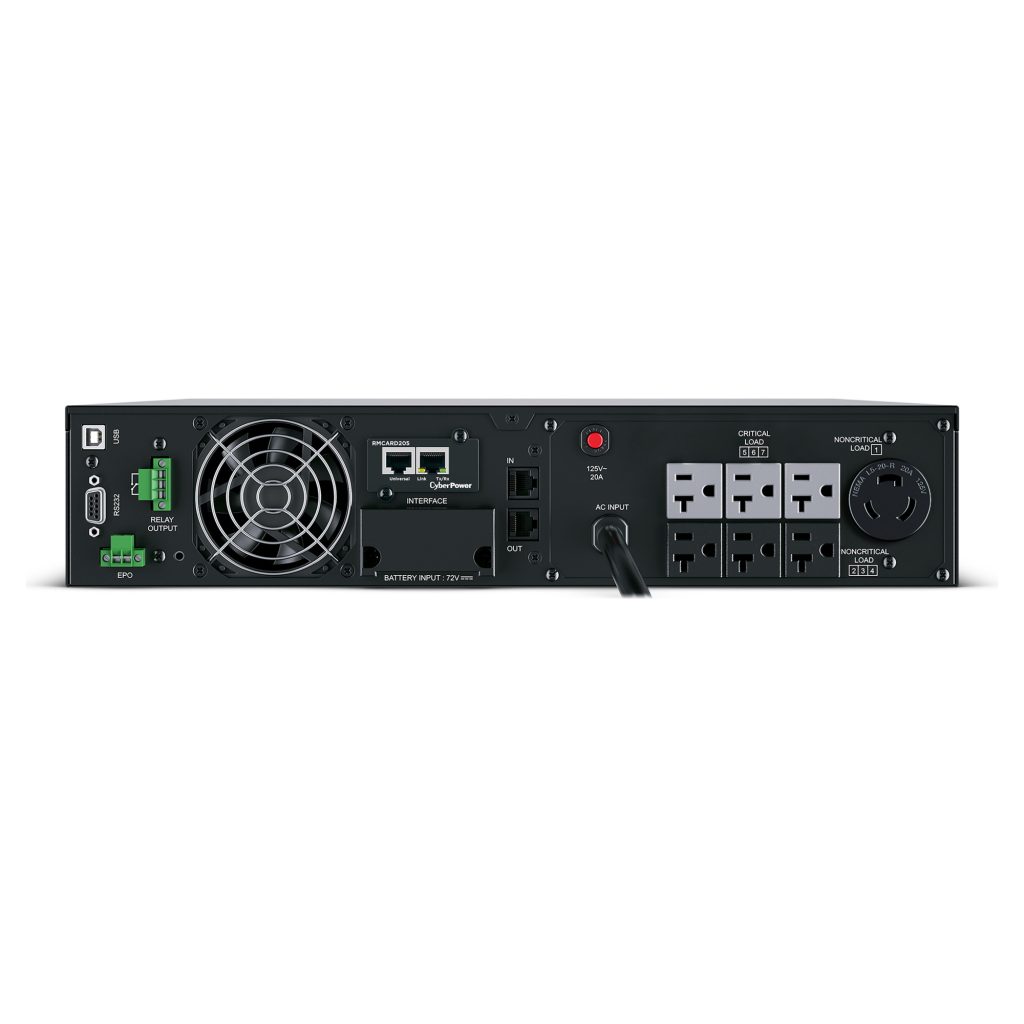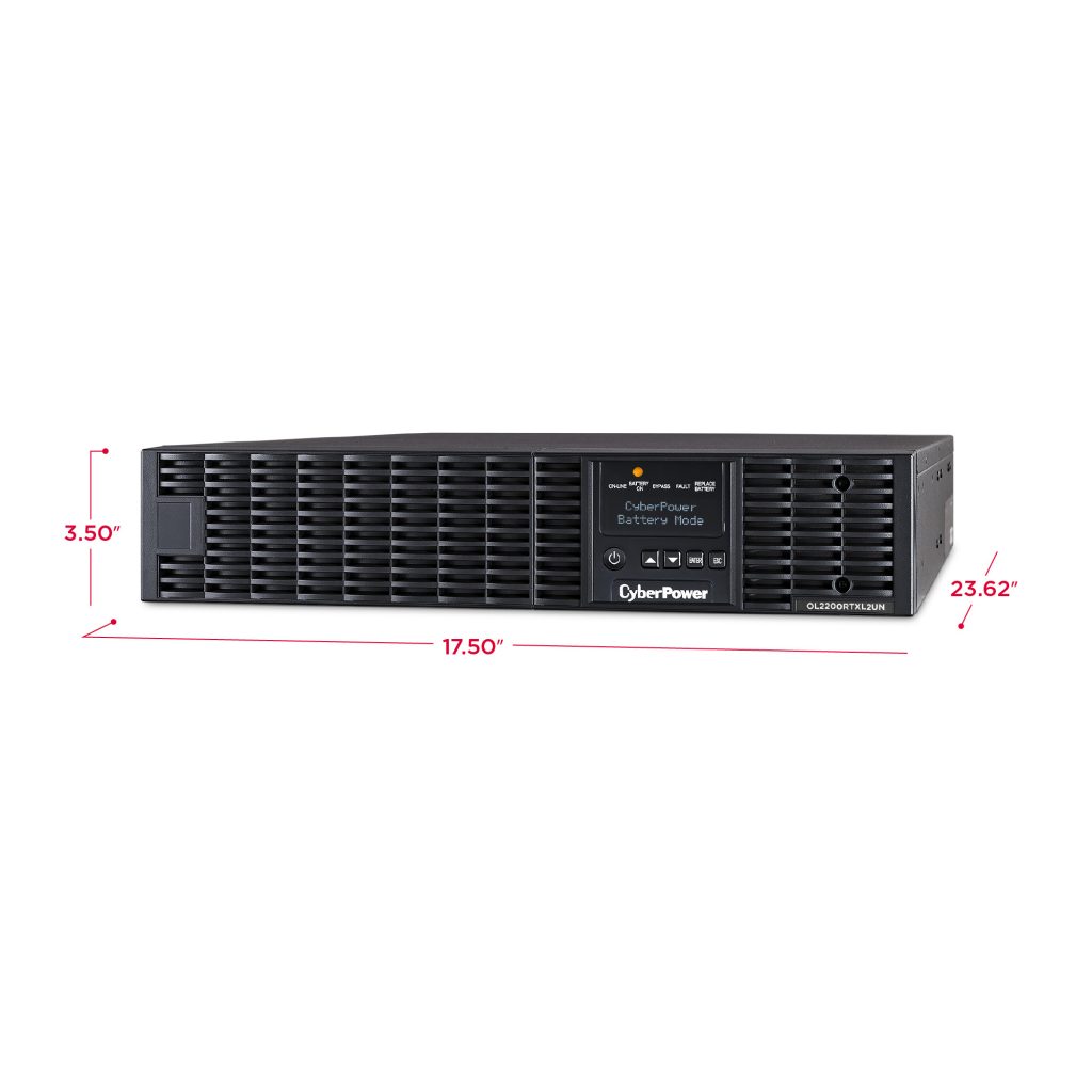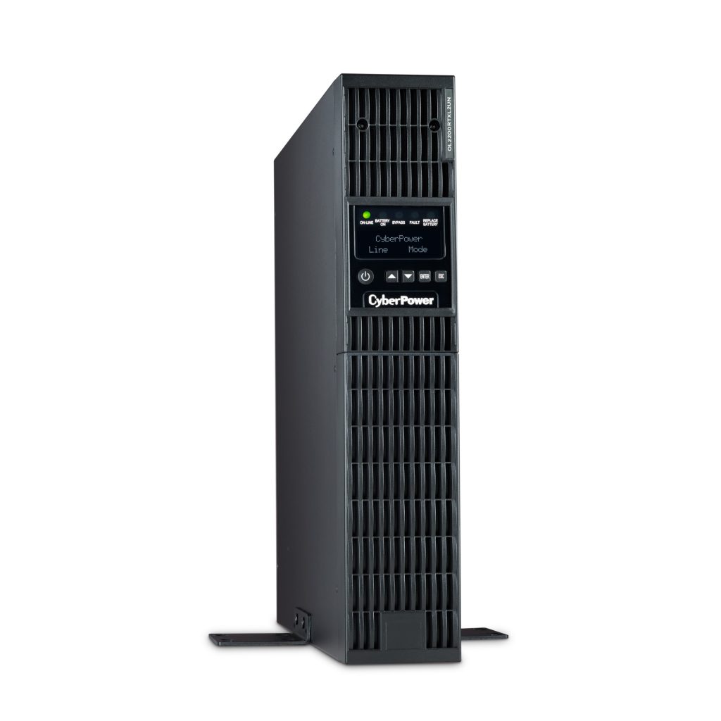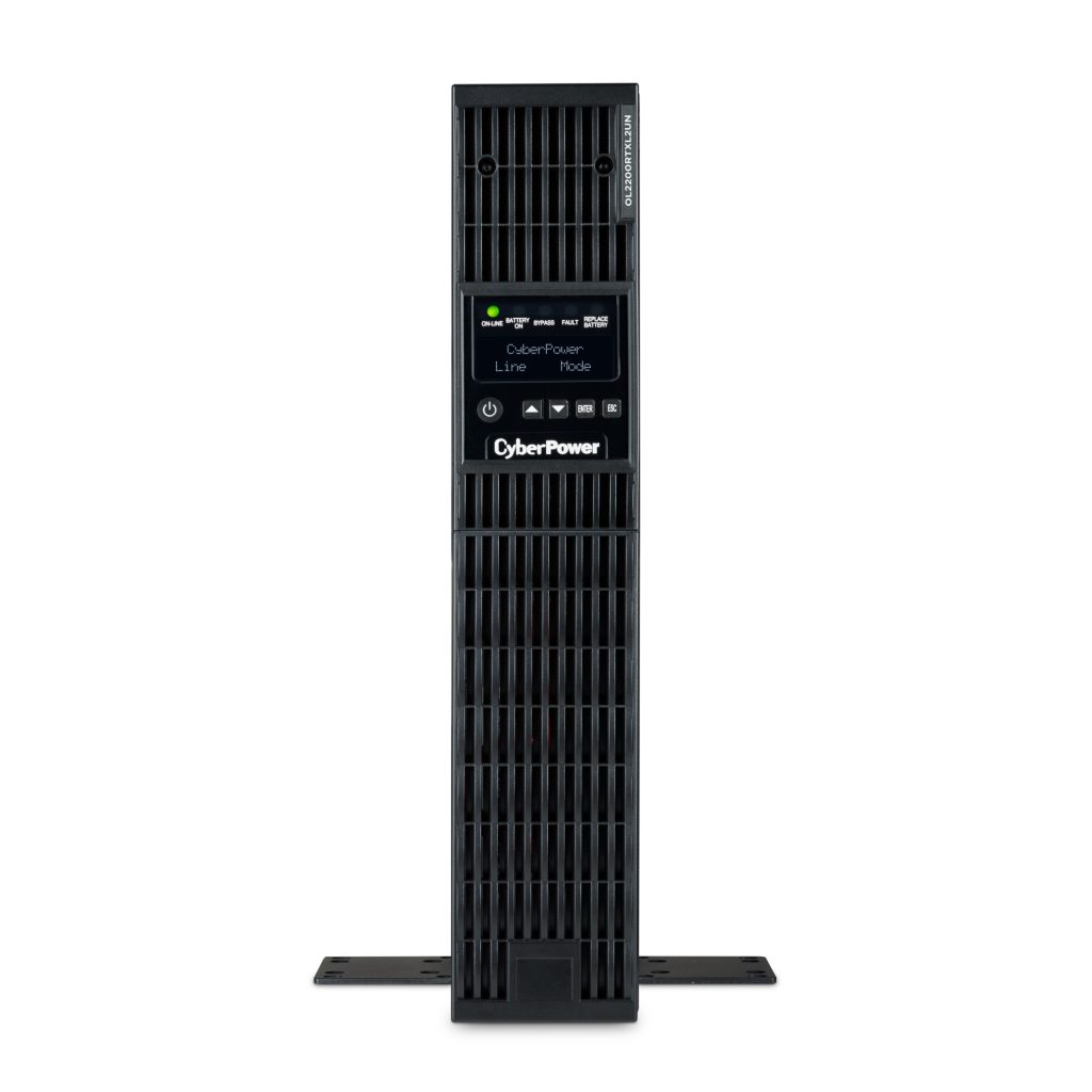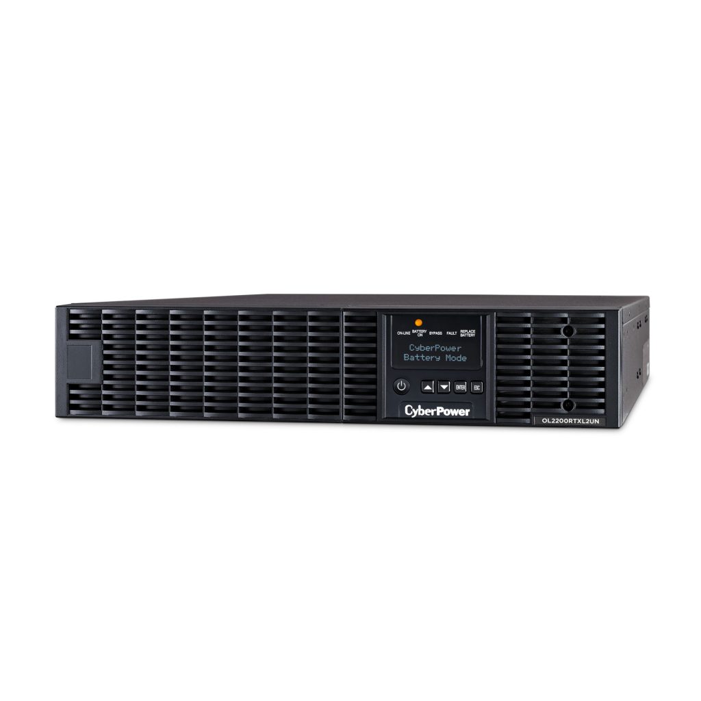 The CyberPower OL2200RTXL2UN is a rack/tower UPS with double conversion topology. It provides sine wave output to critical applications and equipment that require seamless power correction. The Extended Battery Module (EBM) expands runtime, and Fast Charge Technology restores full backup power faster. This model comes with an extendable LCD control panel, Smart Battery Management charging technology, and energy-saving GreenPower UPS™ ECO Mode.