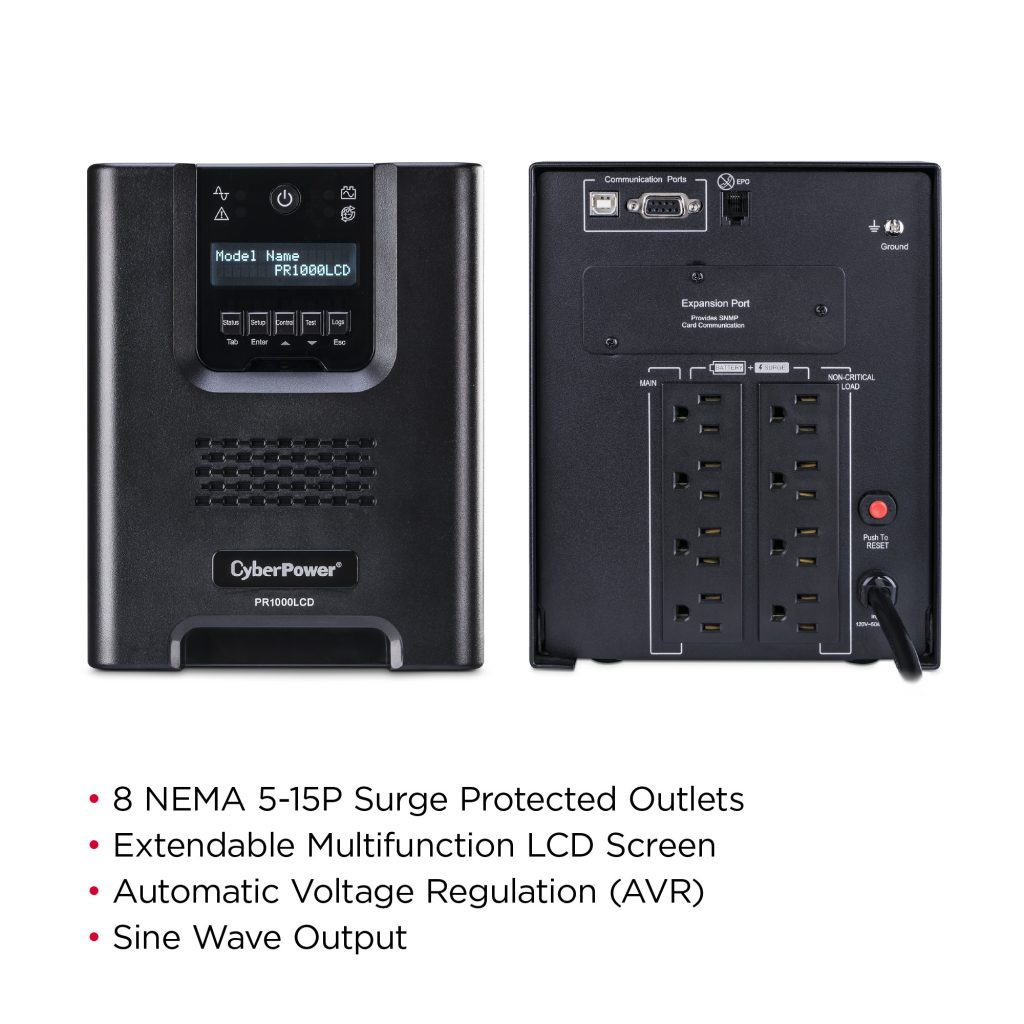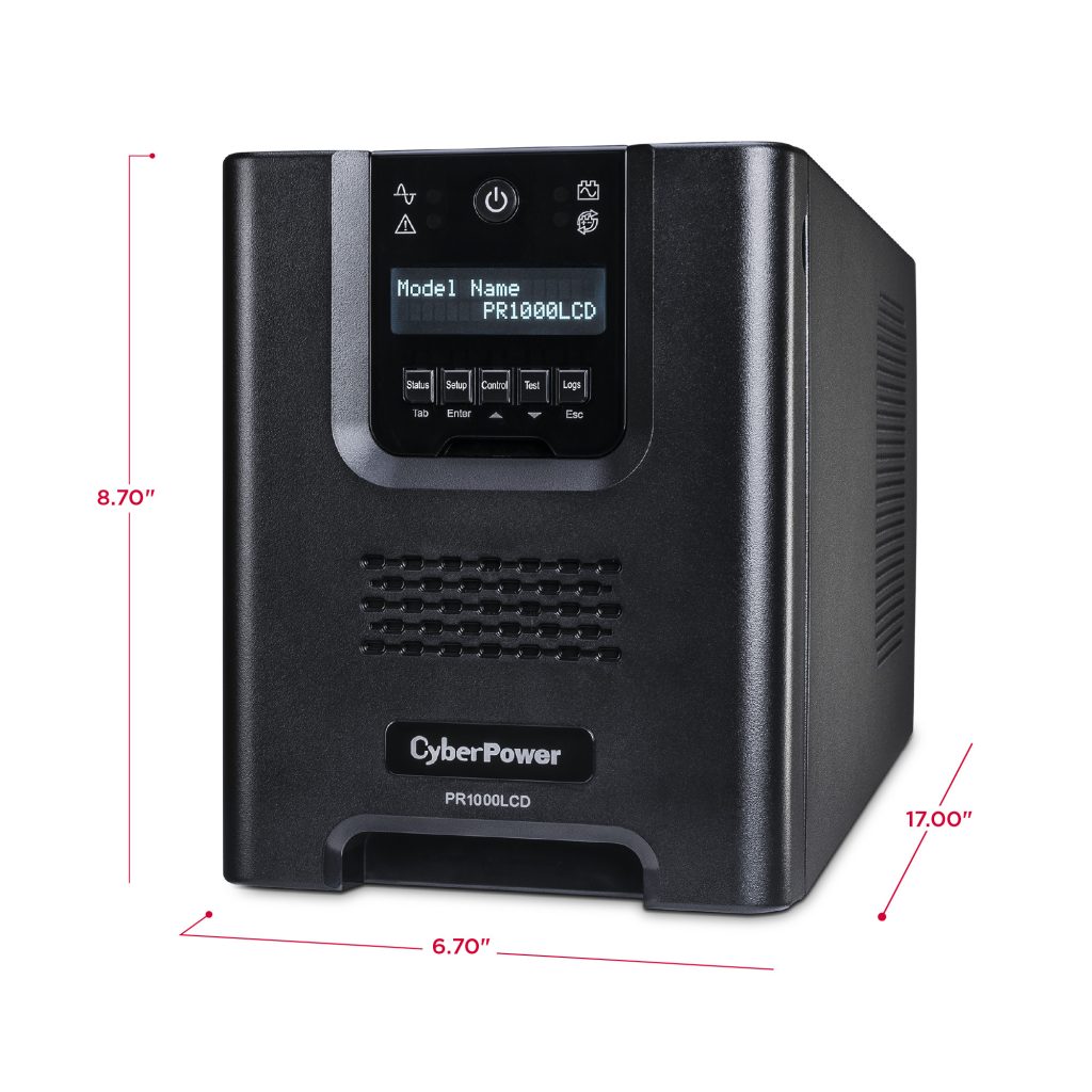 A mini-tower UPS with line interactive topology, the CyberPower Smart App Sinewave PR1000LCD provides battery backup, power protection (using sine wave output), and surge protection for corporate servers, department servers, storage appliances, network devices, and telecom installations requiring Active PFC power source compatibility. The PR1000LCD uses Automatic Voltage Regulation (AVR) to correct minor power fluctuations without switching to battery power, which extends battery life. AVR is essential in areas where power fluctuations occur frequently. The PR1000LCD comes with a three-year warranty and a $375,000 Connected Equipment Guarantee.