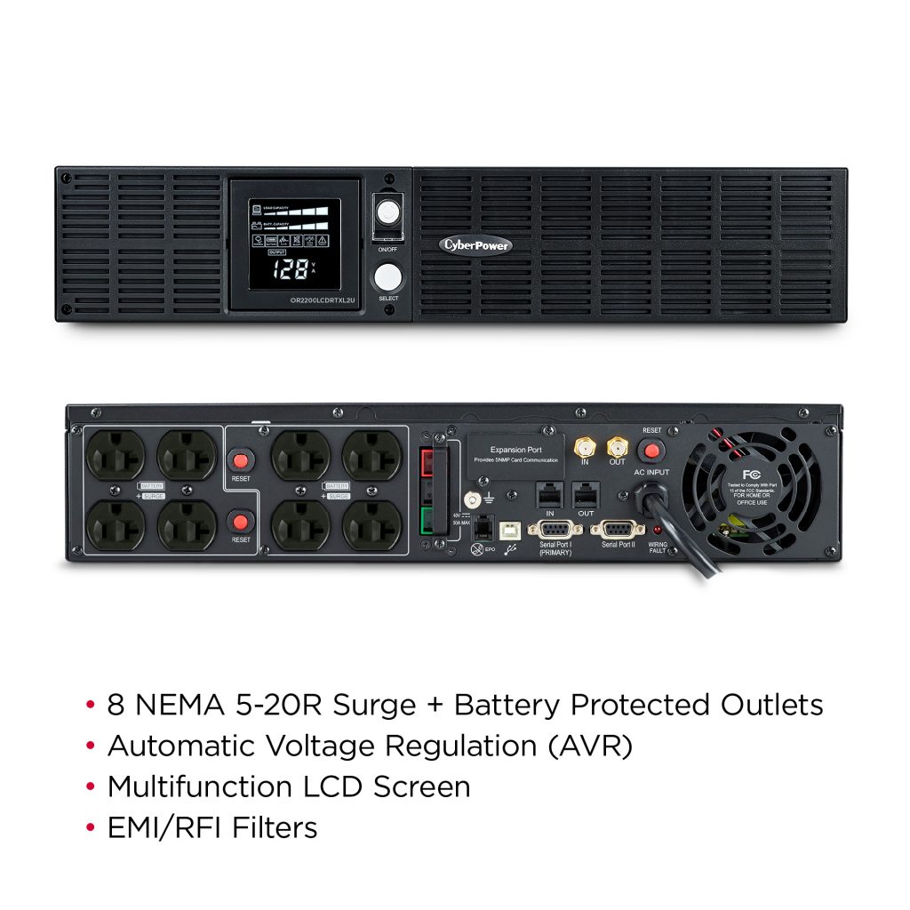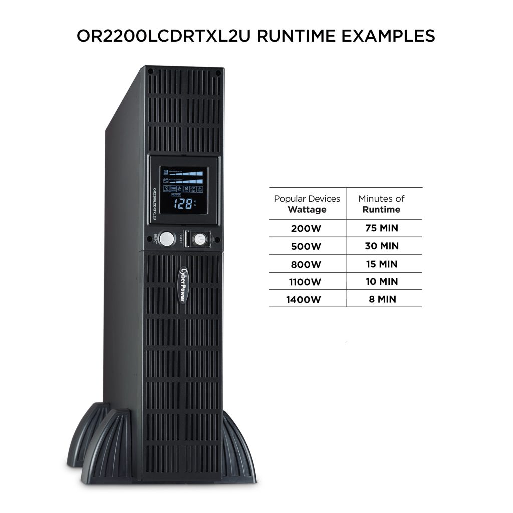 A rack/tower convertible UPS with line interactive topology, the CyberPower Smart LCD OR2200LCDRTXL2U provides battery backup (using simulated sine wave output) and surge protection for department servers, workgroup servers, workstations, network devices, and telecom installations without active PFC power supplies. The OR2200LCDRTXL2U uses Automatic Voltage Regulation (AVR) to correct minor power fluctuations without switching to battery power, which extends battery life. AVR is essential in areas where power fluctuations occur frequently. This model accepts the RMCARD205 network management card for remote management and control via a standard web browser or network management system. The OR2200LCDRTXL2U comes with a three-year warranty and a $300,000 Connected Equipment Guarantee.