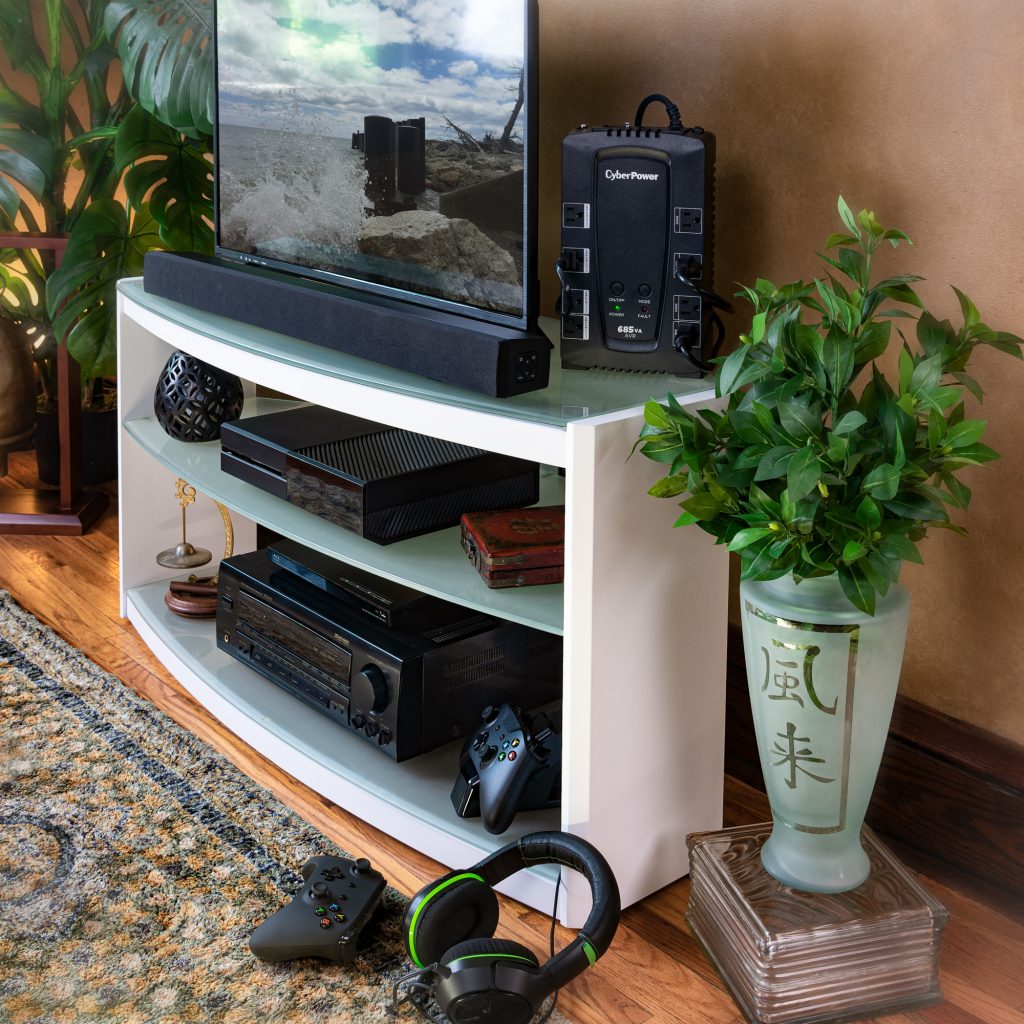 The CyberPower CP685AVRG uninterruptible power supply (UPS) system provides battery backup and surge protection for lightning-induced surges and other power events that can damage electronic equipment. This UPS, with line-interactive topology, uses simulated sine wave output to deliver battery backup to power connected electronics during a utility power failure. The unit has enough runtime to perform a graceful shutdown to protect against the loss of data and damage to valuable desktop computers, workstations, networking devices, and home entertainment systems.