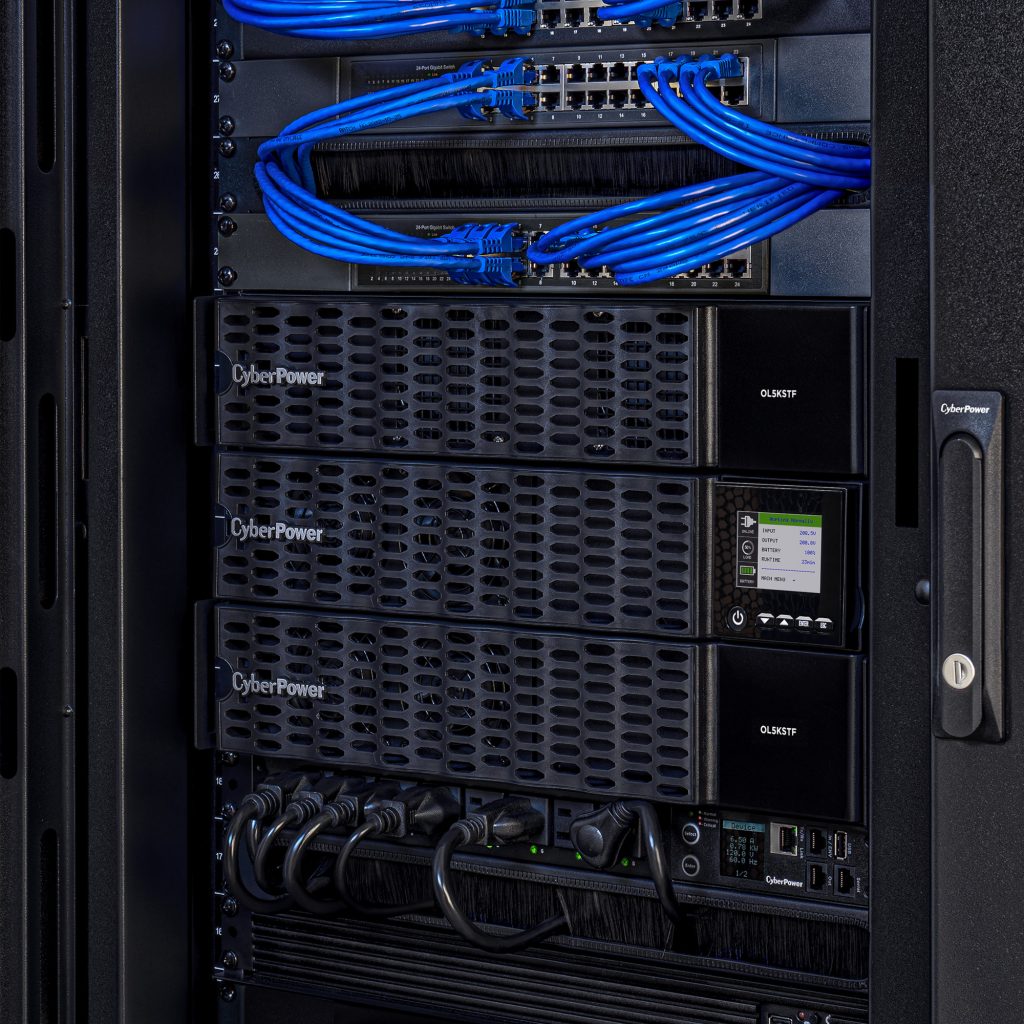 The CyberPower Smart App Online OL5KSTF rack/tower step-down isolation transformer converts 208 V input voltage originating from utility power, a UPS, or a generator to 120 V output.