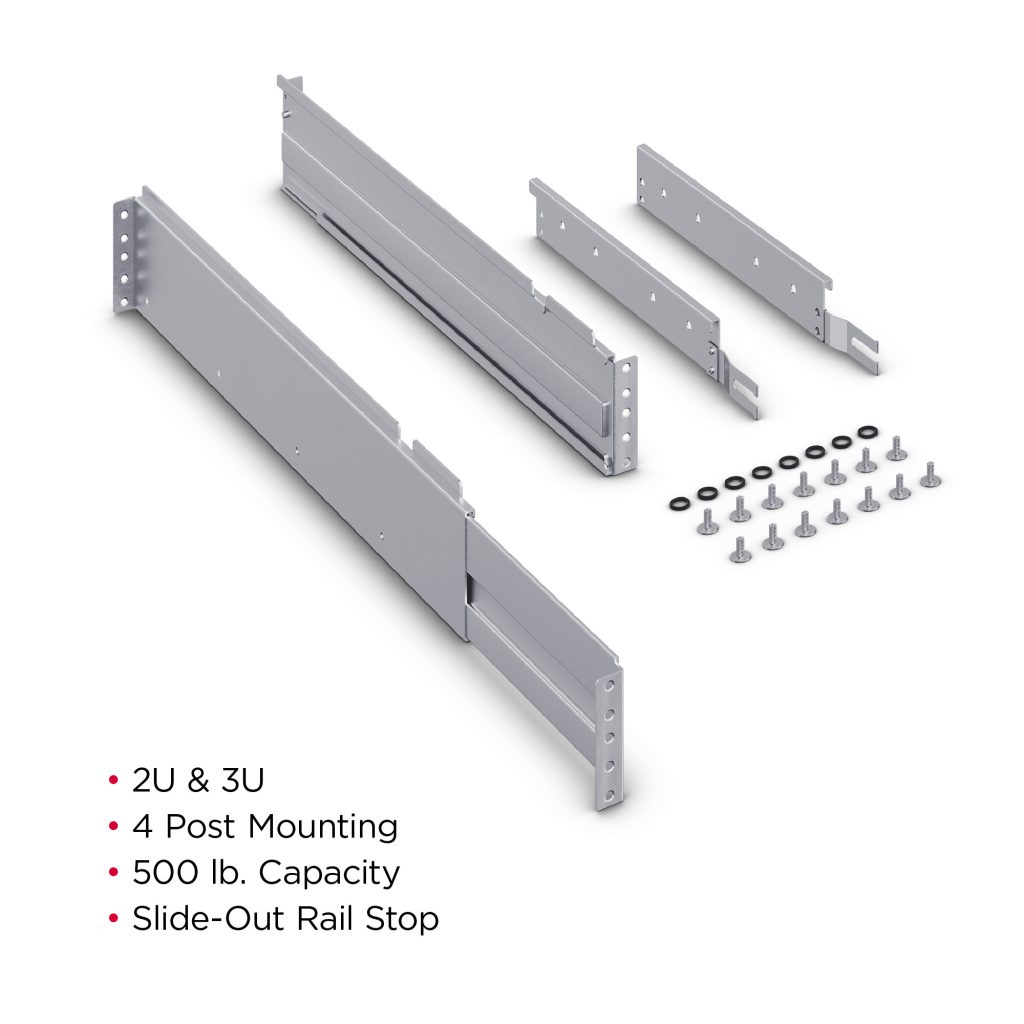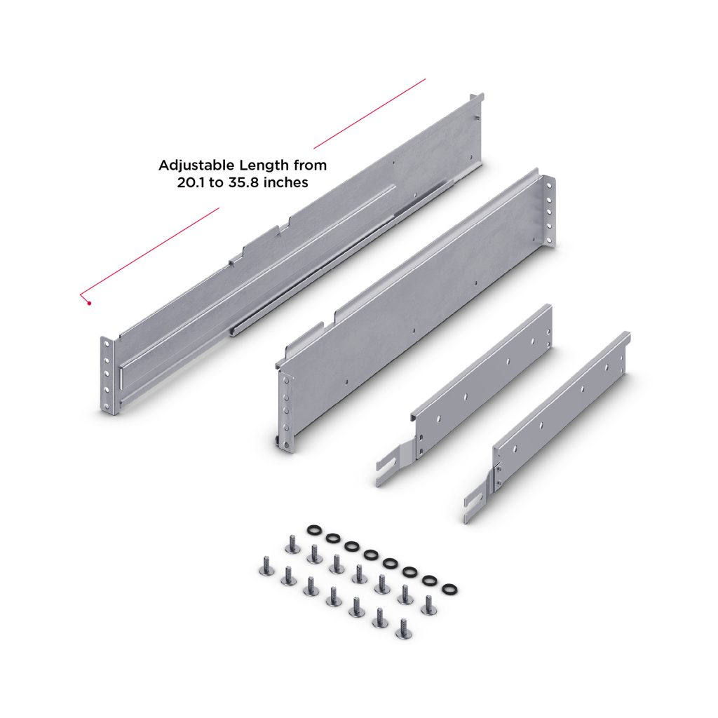 The CyberPower CP2RAIL02 4-post rackmount rail kit provides a mounting solution for select 2U and 3U UPS systems weighing up to 500 pounds. The two adjustable rails (right and left) can be expanded from 20.1" to 35.8" for various sizing requirements and installed by a single person.