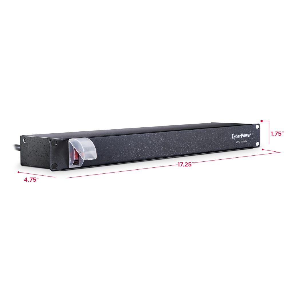 The CyberPower CPS1215RM, a 10-outlet (rear) rackmount power distribution unit (PDU), provides 100-125V 15A output. It distributes power to 10 NEMA 5-15R receptacles from a single NEMA 5-15P input with unfiltered electrical pass-through. Designed for datacenters and other electrically demanding applications, the CPS1215RM has durable metal housing and a 15-foot AC power cord. It can be mounted horizontally, includes a cord retention tray, and is UL Recognized. The CPS1215RM comes with a three-year limited warranty and covers defects in materials and workmanship in the product under normal use and conditions within three years of the purchase date.
