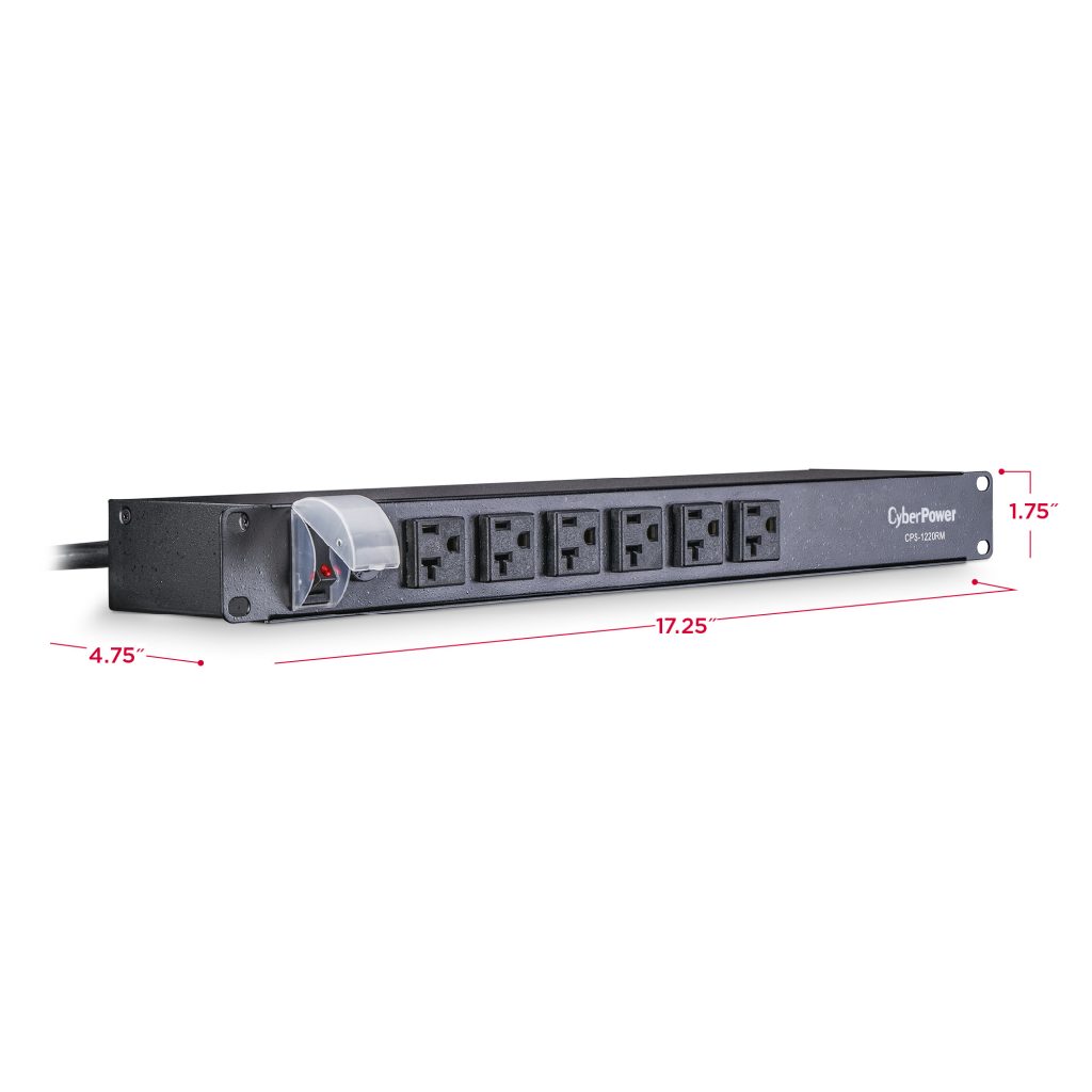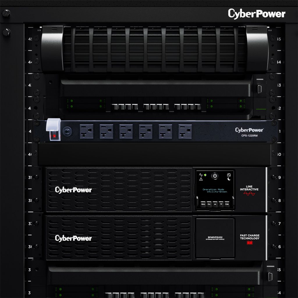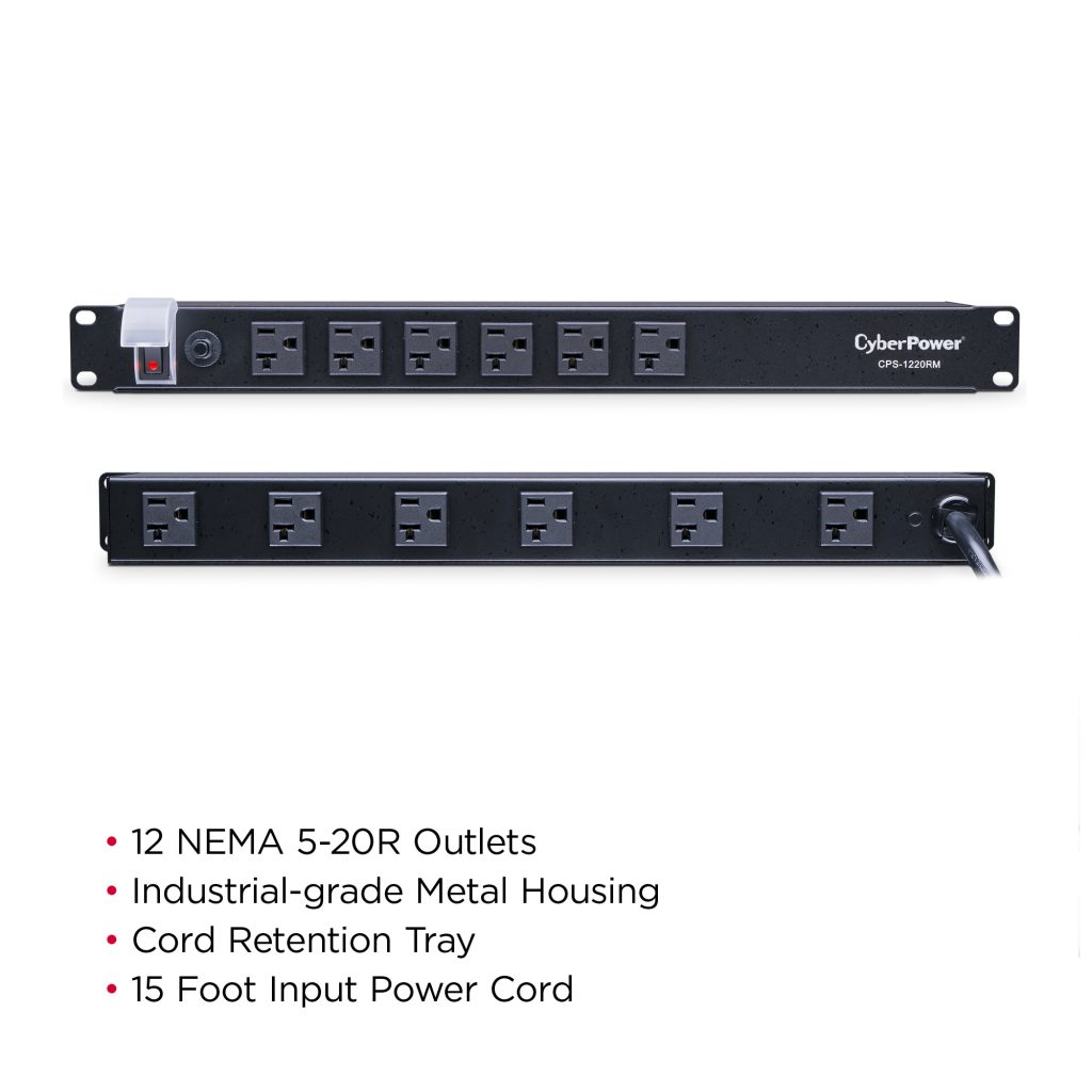 The CyberPower CPS1220RM, a 12-outlet (6 front, 6 rear) rackmount power distribution unit (PDU), provides 100 – 125 V 20A output. It distributes power to 10 NEMA 5-20R receptacles from a single NEMA 5-20P input with unfiltered electrical pass-through. Designed for datacenters and other electrically demanding applications, the CPS1220RM has durable metal housing and a 15-foot AC power cord. It can be mounted horizontally, includes a cord retention tray, and is ETL/RoHS certified. A three-year warranty covers the CPS1220RM for three years for as long as you own the product.