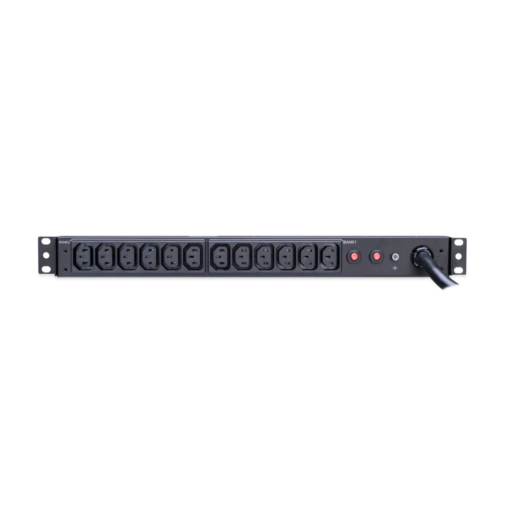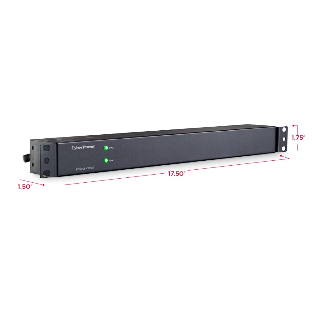 The CyberPower PDU30BHVT12R, a 12-outlet (rear) rackmount basic power distribution unit (PDU), provides 200V/230V 30A output. It distributes power to 12 IEC-320 C13 receptacles from a single NEMA L6-30P twist lock plug with unfiltered electrical pass-through. Designed for datacenters and other electrically demanding applications, the PDU30BHVT12R has rugged, industrial-grade metal housing and a 10-foot AC power cord. It can be mounted either horizontally or vertically, includes a cord retention tray, and is ETL/RoHS certified. A limited lifetime warranty covers defects in materials and workmanship in the product under normal use and conditions.
