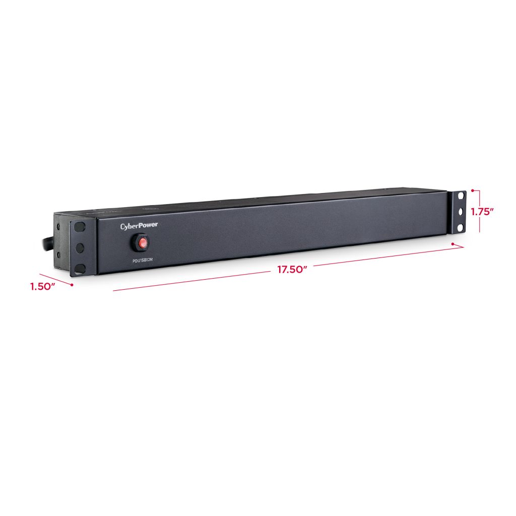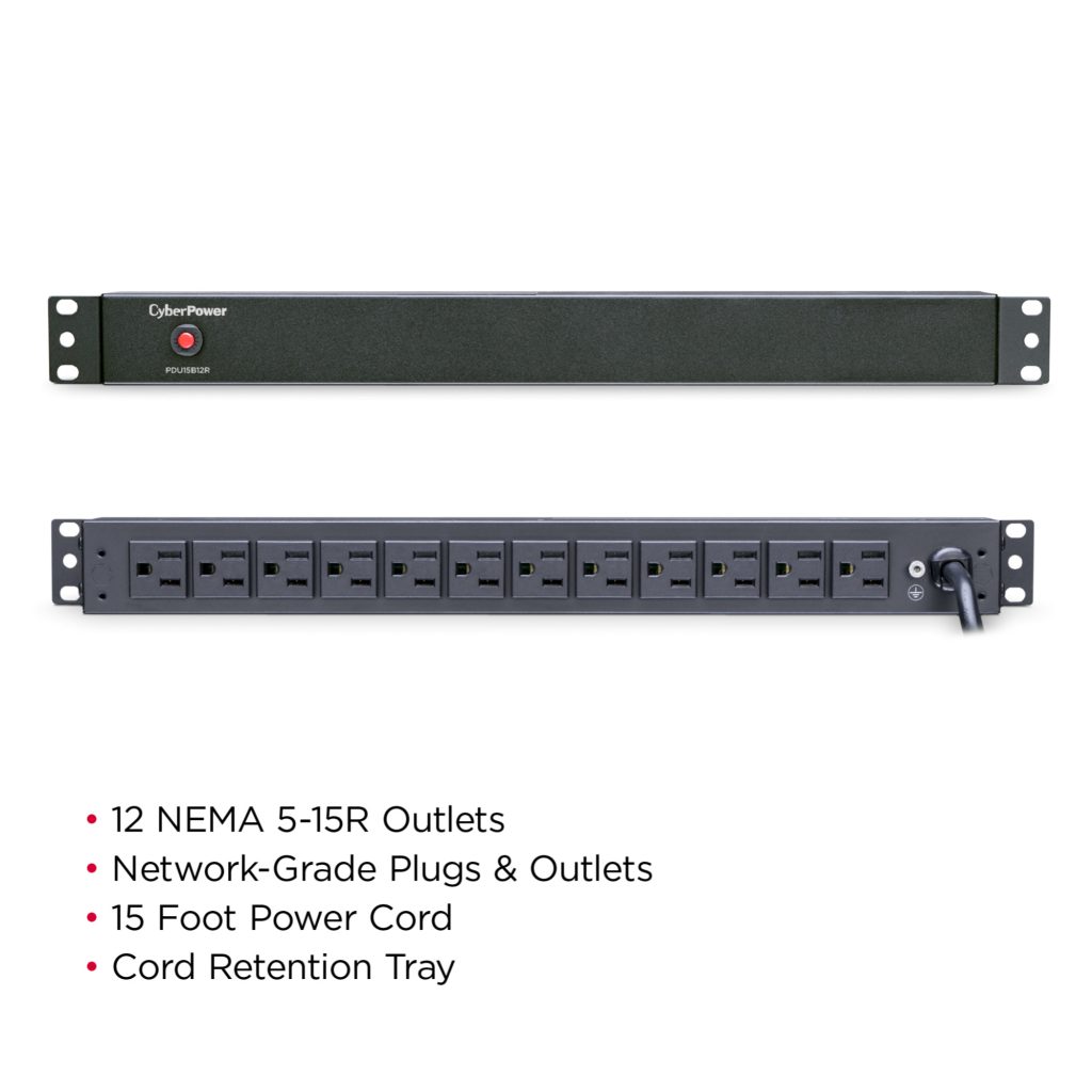 The CyberPower PDU15B12R, a 12-outlet (rear) rackmount basic power distribution unit (PDU), provides 100 – 125 V 15A output. It distributes power to 12 NEMA 5-15R receptacles from a single NEMA 5-15P input with unfiltered electrical pass-through. Designed for datacenters and other electrically demanding applications, the PDU15B12R has rugged, industrial-grade metal housing and a 15-foot AC power cord. It can be mounted either horizontally or vertically, includes a cord retention tray, and is ETL/RoHS certified. A limited lifetime warranty covers defects in materials and workmanship in the product under normal use and conditions.