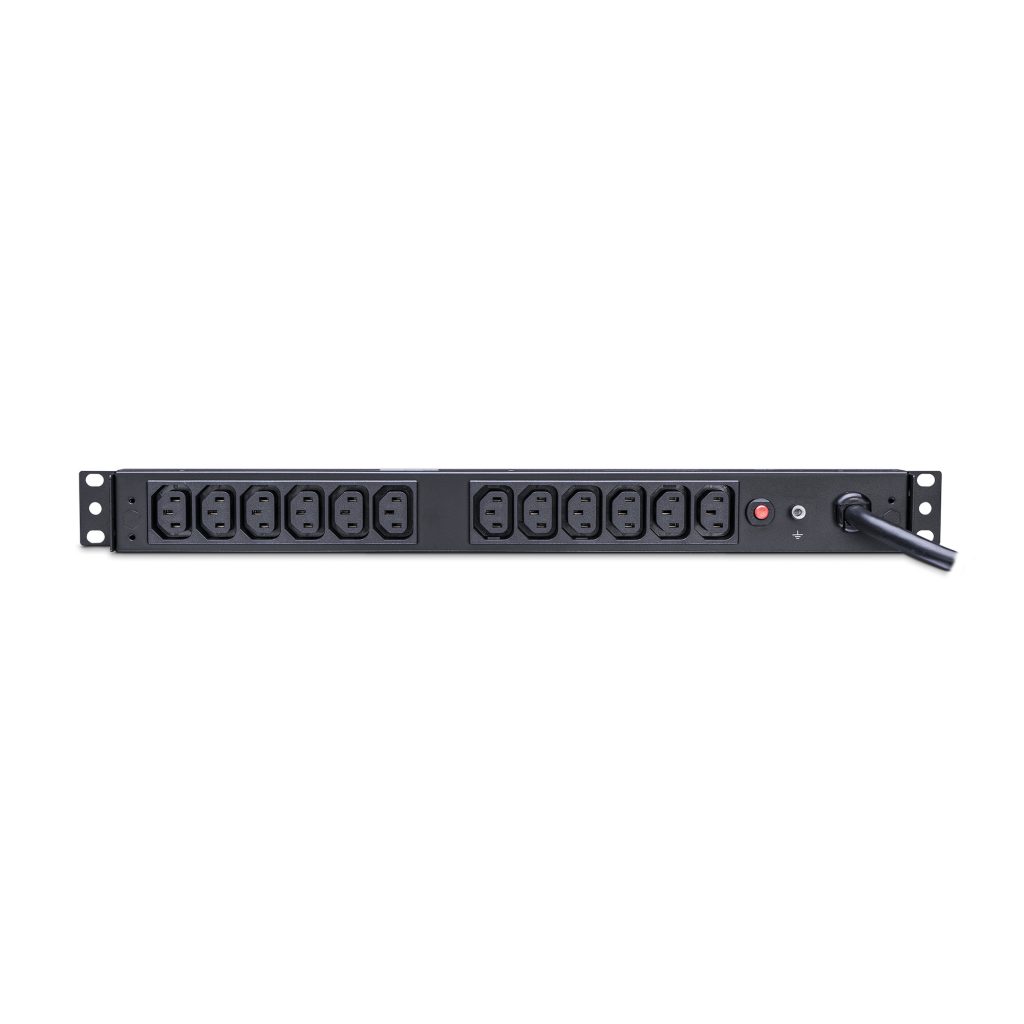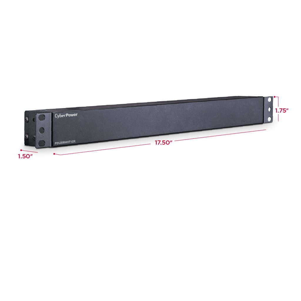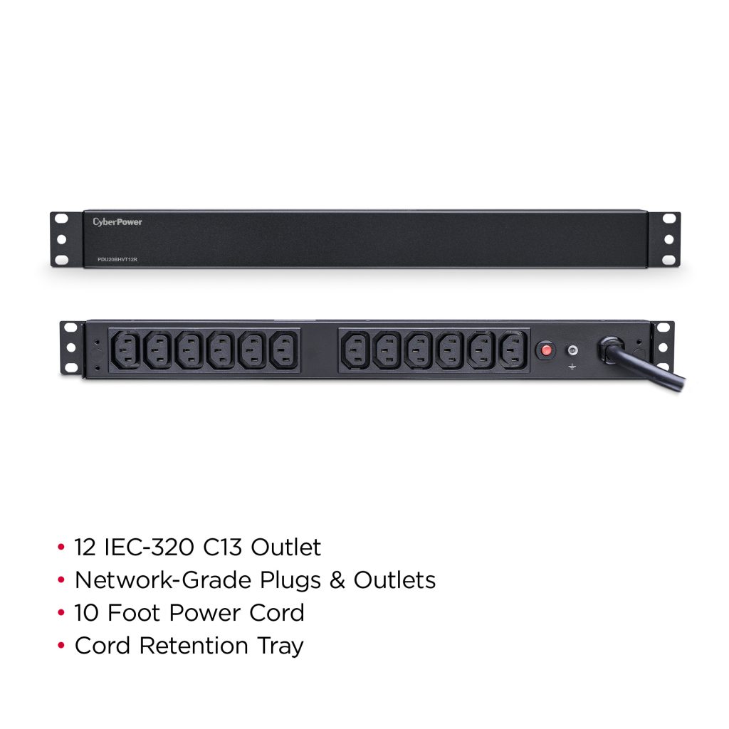 The CyberPower PDU20BHVT12R, a 12-outlet (rear) rackmount basic power distribution unit (PDU), provides 208V/230V 20A output. It distributes power to 12 IEC-320 C13 receptacles from a single NEMA L6-20P twist lock plug with unfiltered electrical pass-through. Designed for datacenters and other electrically demanding applications, the PDU20BHVT12R has rugged, industrial-grade metal housing and a 10-foot AC power cord. It can be mounted either horizontally or vertically, includes a cord retention tray, and is ETL/RoHS certified. A limited lifetime warranty covers defects in materials and workmanship in the product under normal use and conditions.