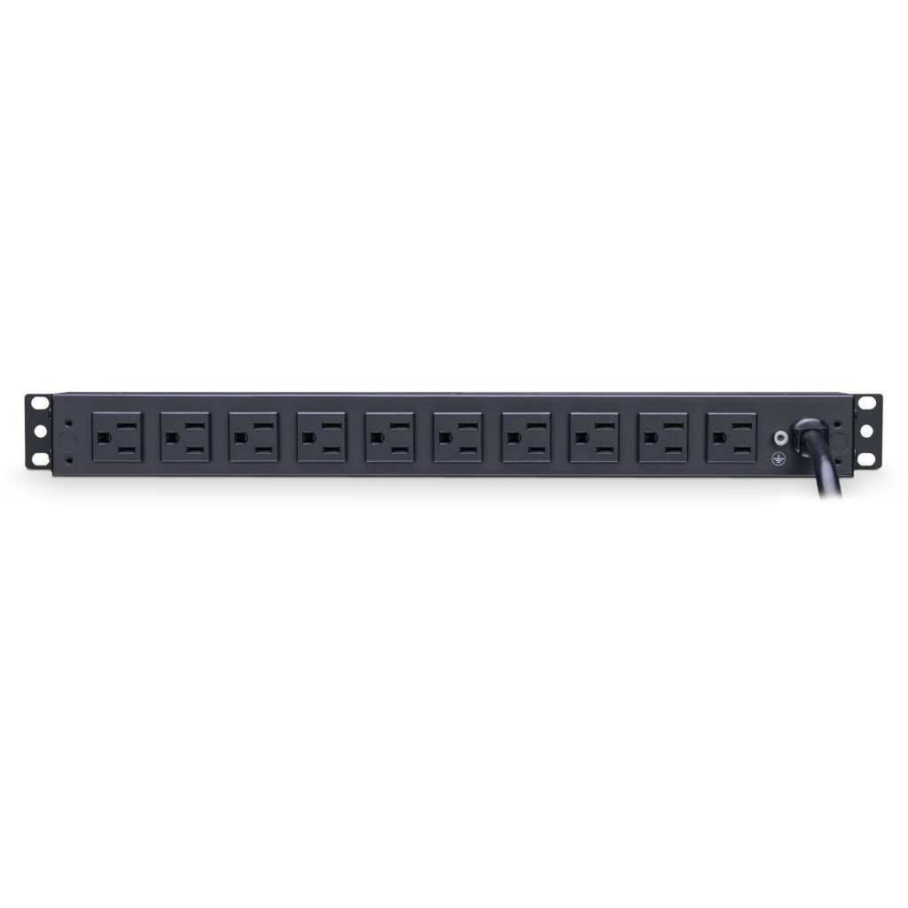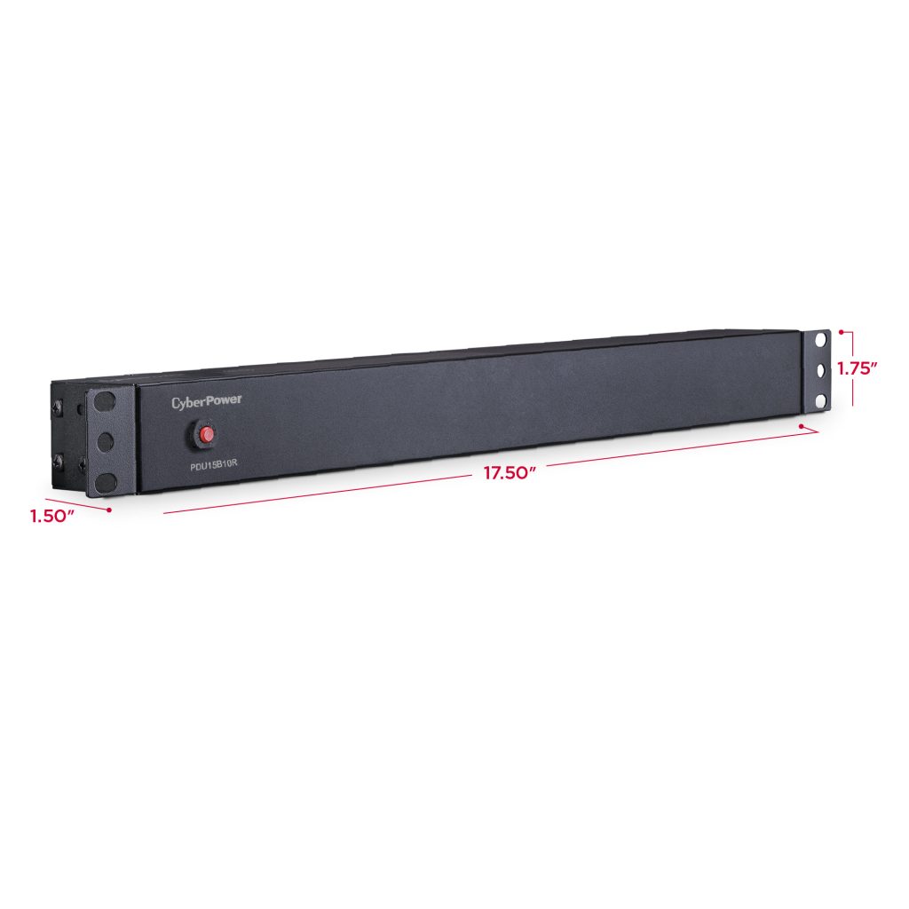 The CyberPower PDU15B10R, a 10-outlet (rear) rackmount basic power distribution unit (PDU), provides 100 – 125 V 15A output. It distributes power to 10 NEMA 5-15R receptacles from a single NEMA 5-15P input with unfiltered electrical pass-through.