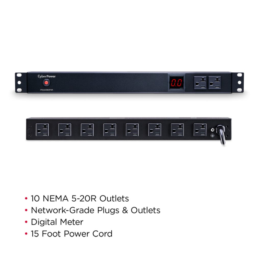 The CyberPower PDU20M2F8R, a 10-outlet (2 front, 8 rear), rackmount metered power distribution unit (PDU), provides 100 – 125 V 20A output. It distributes power to 10 NEMA 5-20R receptacles from a single NEMA 5-20P input with unfiltered electrical pass-through. The current draw for connected equipment is displayed in amps on the front LCD for real-time load monitoring.