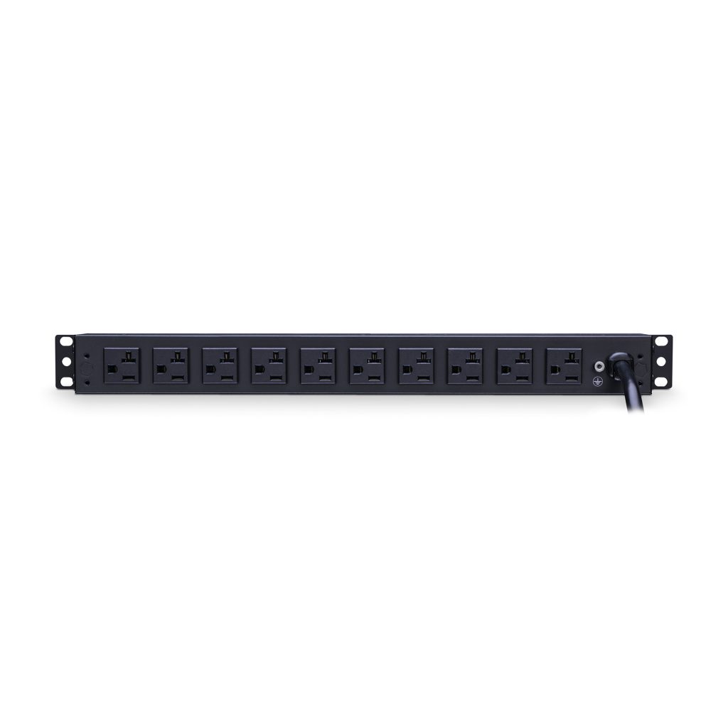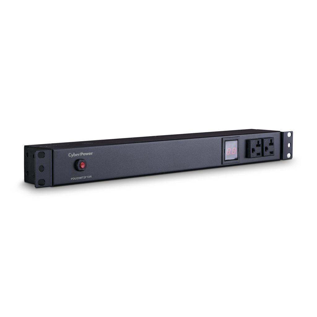 The CyberPower PDU20MT2F10R, a 12-outlet (2 front, 10 rear), rackmount metered power distribution unit (PDU), provides 100 – 125 V 20A output. It distributes power to 12 NEMA 5-20R receptacles from a single NEMA L5-20P twist lock plug with unfiltered electrical pass-through. The current draw for connected equipment is displayed in amps on the front LCD for real-time load monitoring.