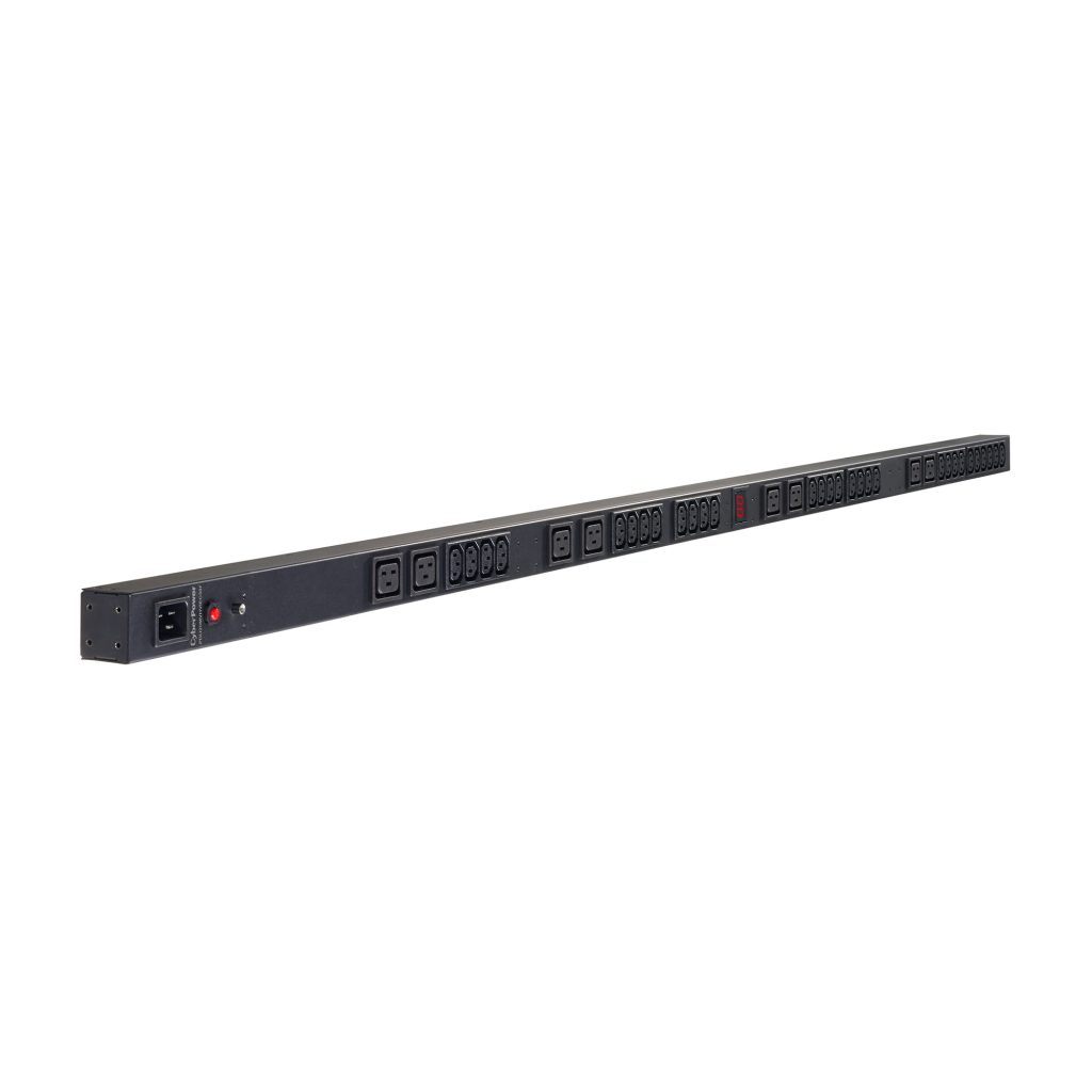 The CyberPower PDU20MVHVIEC38F, a 38-outlet (front), 0U vertical rackmount basic power distribution unit (PDU) provides 200/230V 20A output. It distributes power to 30 IEC-320 C13, 8 IEC-320 C19 receptacles from a single IEC-320 C20 plug with unfiltered electrical pass-through. The current draw for connected equipment is displayed in amps on the front LCD for real-time load monitoring.