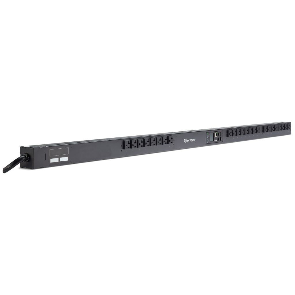 The CyberPower PDU31101, a 24-outlet (front), 0U rackmount monitored power distribution unit (PDU) provides 120V 20A output. It distributes power to 24 NEMA 5-20R receptacles from a single NEMA L5-20P plug with unfiltered electrical pass-through. (May be converted to non-locking NEMA 5-20P plug with included adapter.) Monitor power status over the network by using the CyberPower management console and the RJ45 Ethernet port for network connection. Monitor power status locally by using the LCD.