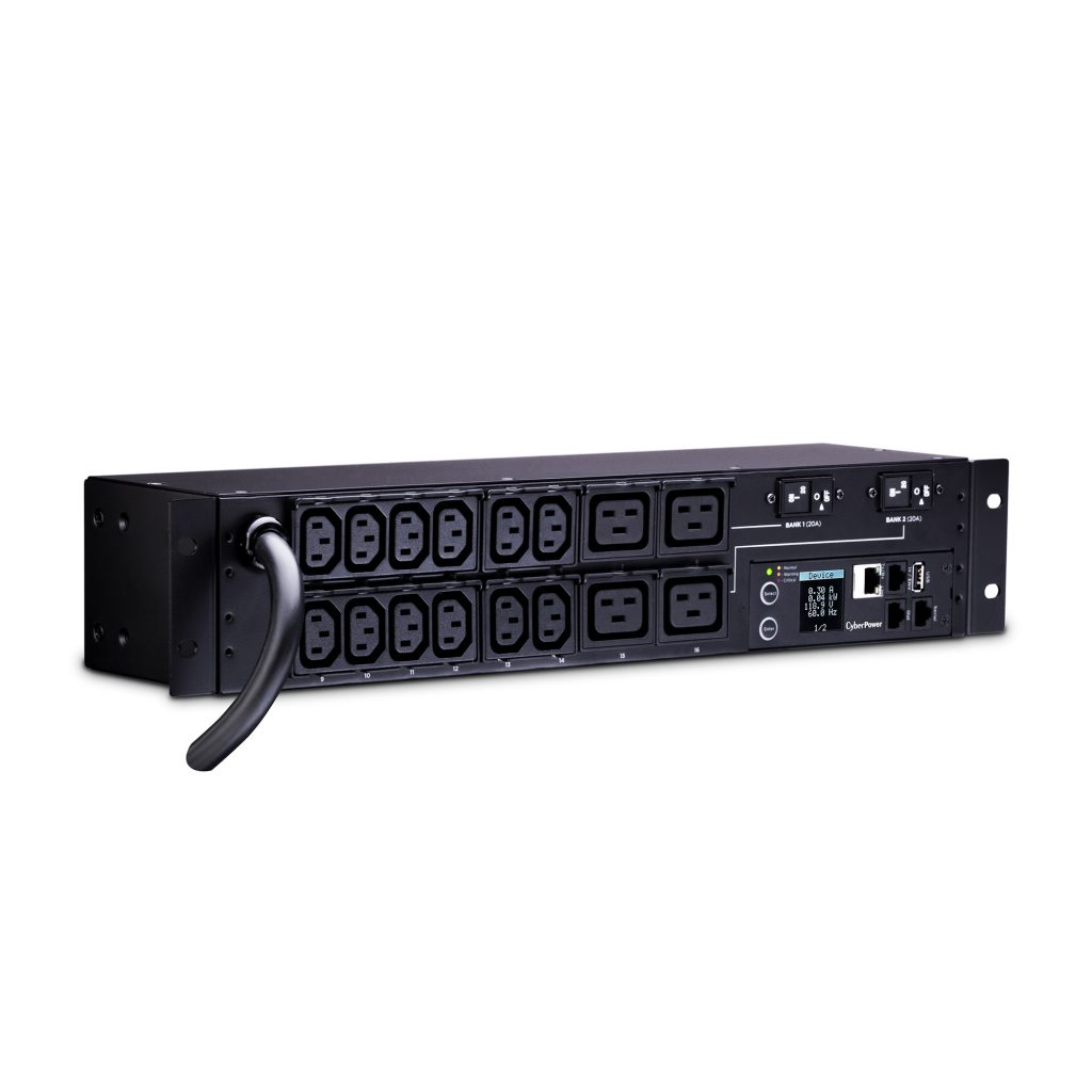 The CyberPower PDU31008, a 2U rackmount, monitored power distribution unit (PDU) provides 200-240Vac, 30A output via twelve (12) IEC C13 and four (4) IEC C19 receptacles from a single NEMA L6-30P input power plug. Configure and monitor this unit over the network using the CyberPower Management Console and the RJ45 Ethernet port for network connection, or locally from the Power Control Display.