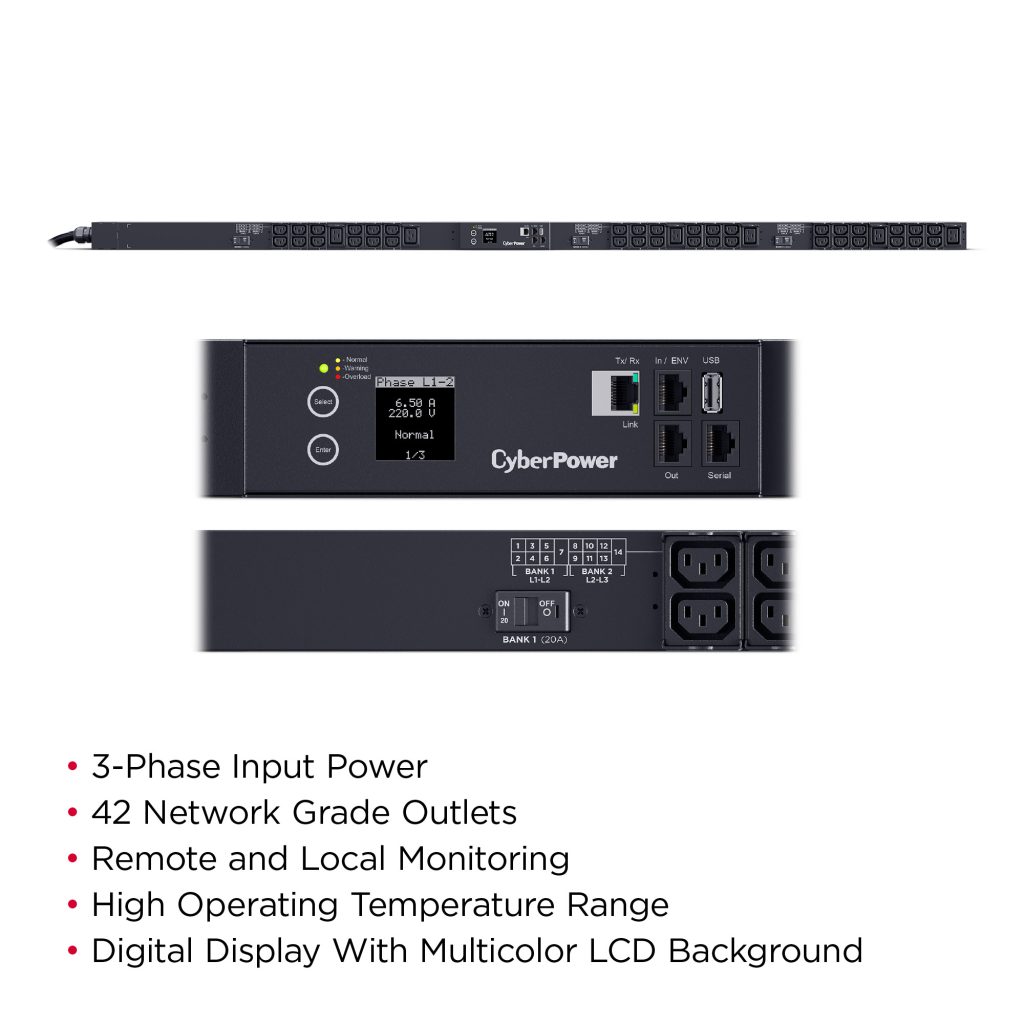 Stay informed about your power with the CyberPower PDU33108 monitored 3-Phase PDU. Ideal for data centers and network closets, this unit provides power monitoring in real time over the network by using the CyberPower management console and the RJ45 Ethernet port for network connection or locally by using the LCD.