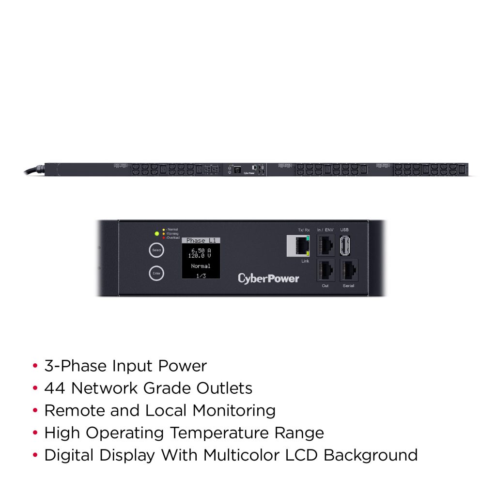 Stay informed about your power with the CyberPower PDU33103 monitored 3-Phase PDU. Ideal for data centers and network closets, this unit provides power monitoring in real time over the network by using the CyberPower management console and the RJ45 Ethernet port for network connection or locally by using the LCD.