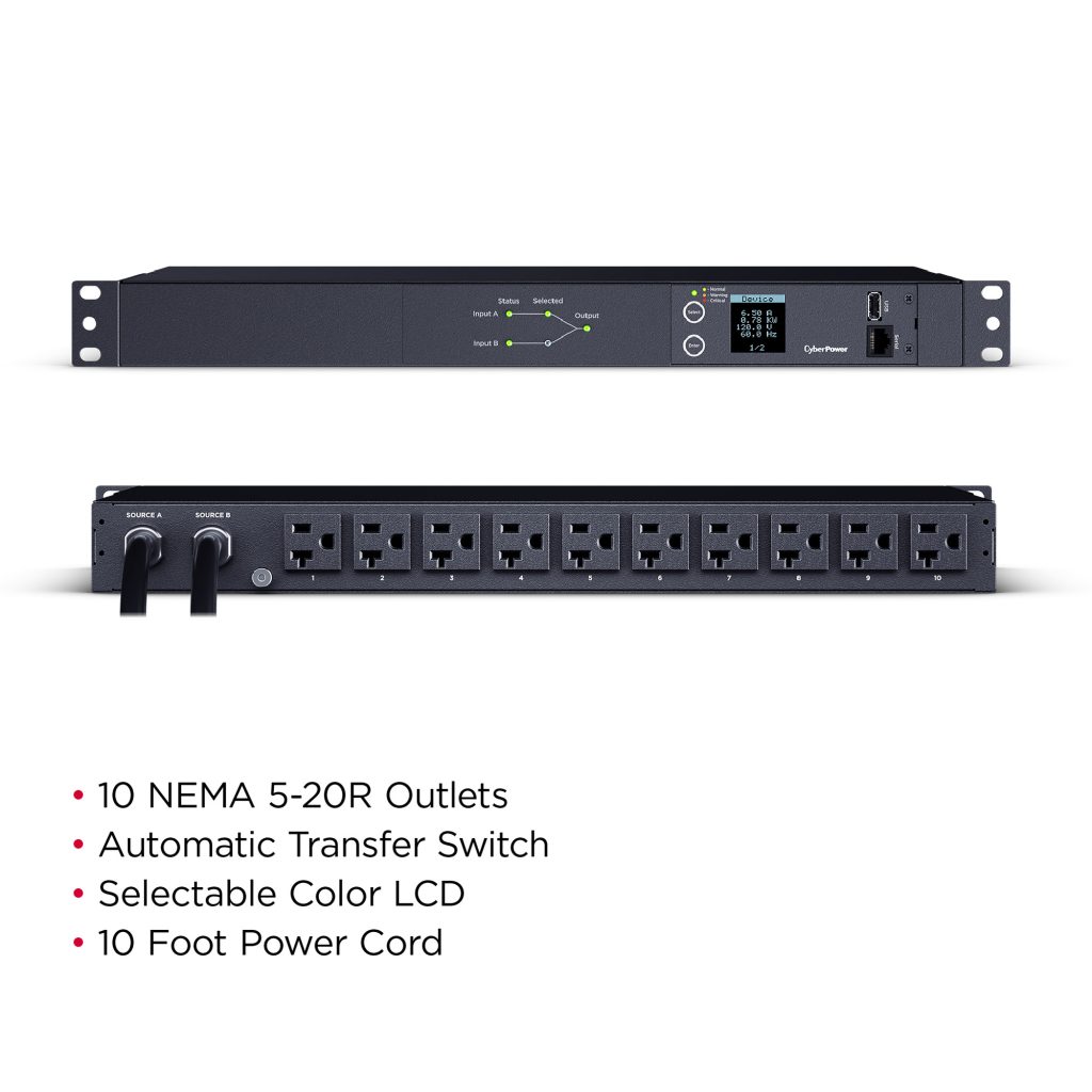 The PDU24002 supports inputs between 100-120V and includes (10) NEMA 5-20R outlets. Dual NEMA L5-20P (L5-20P to non-locking 5-20P adpaters included) power cords are plugged into separate power sources (A and B), and information about each power source is provided via LED indicator lights on the front of the unit. Other features include an LCD with selectable background color, ugradeable firmware, and network-grade plugs and outlets. The CyberPower PDU24002 is protected by a three-year limited warranty.