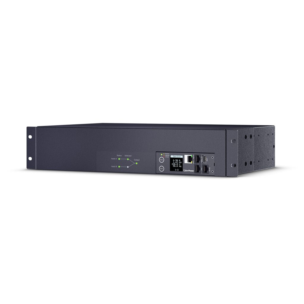 The PDU44007 supports inputs between 200-240V and includes (16) IEC C13, (2) IEC C19, and (1) NEMA L6-30R outlets. Dual NEMA L6-30P power cords are plugged into separate power sources (A and B), and information about each power source is clearly displayed on the front panel LED indicator lights. Other features include an LCD with selectable background color, built-in web interface, and power event notifications. The CyberPower PDU44007 is protected by a three-year limited warranty.