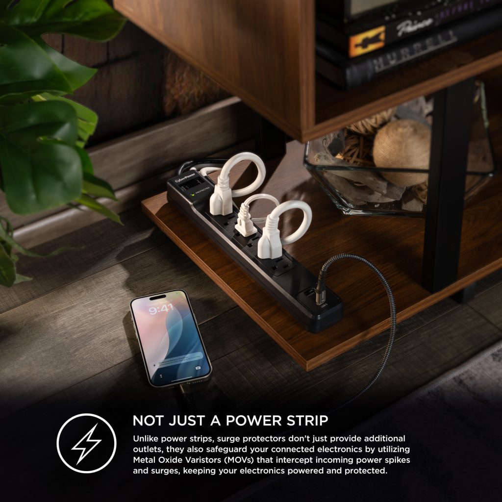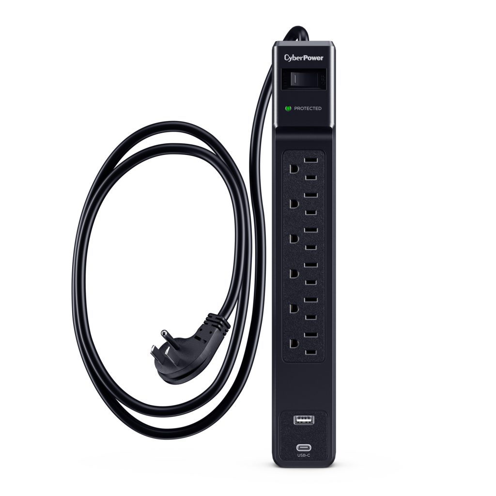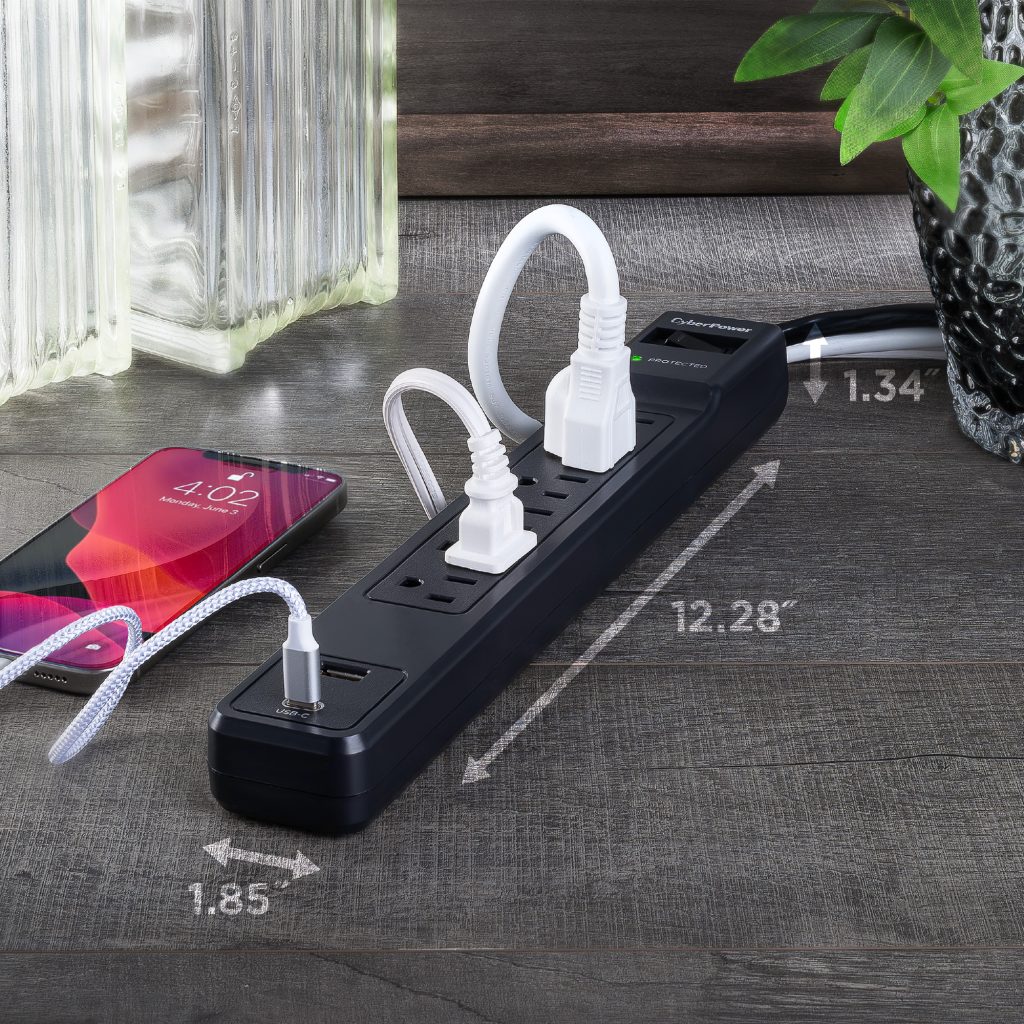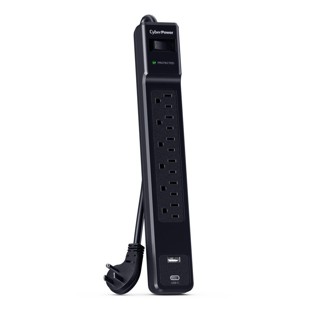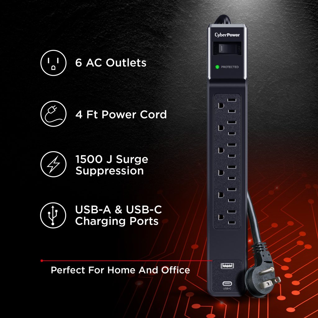 The CyberPower CSP604UC Surge Protector provides essential surge protection for home and office electronics, including computers and other sensitive devices. Engineered to defend against power surges and energy spikes resulting from storms and electrical fluctuations, it offers 1500 joules of protection across six outlets. A durable 4-foot power cord ensures flexible placement, while the inclusion of one USB-A port and one USB-C port enables convenient charging of smartphones, tablets, and other mobile devices without occupying the primary outlets.