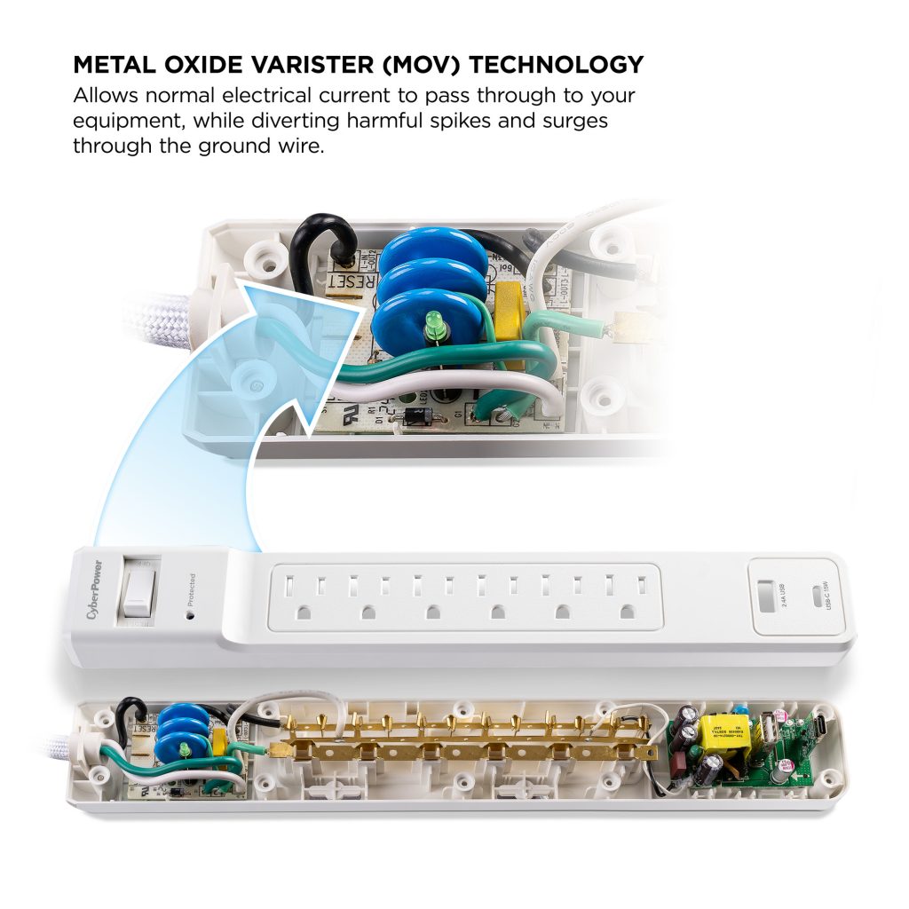 - Metal Oxide Varistor (MOV) Technology Permits the flow of normal electrical current while redirecting power surges and spikes through the ground circuit, ensuring the protection of connected electronics and the surge suppressor.