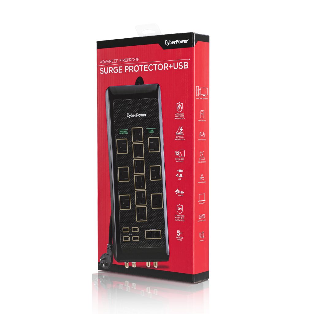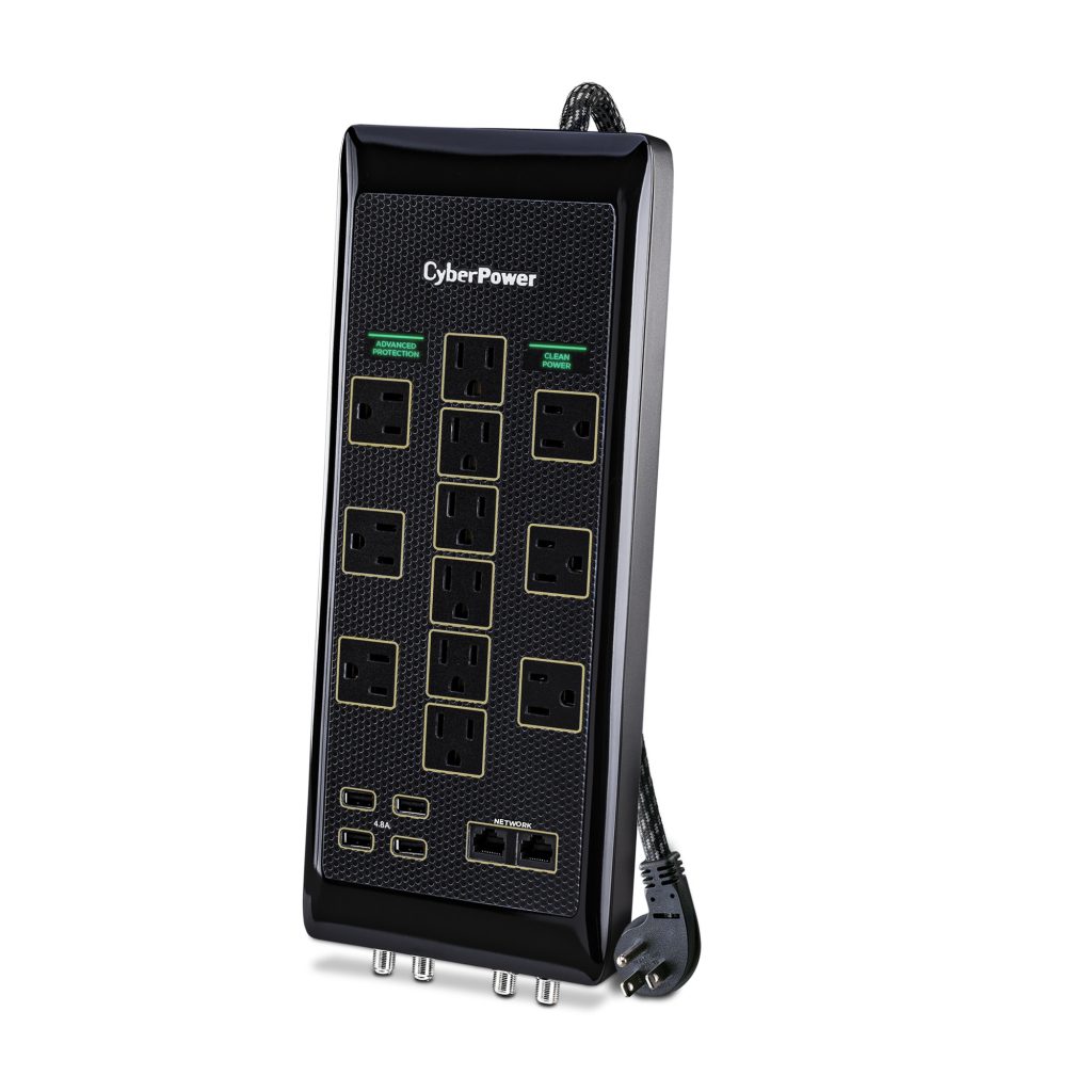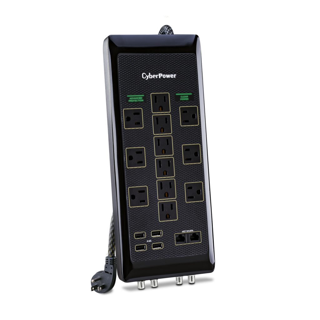 The CyberPower Premium Surge Protector PBJ5UC is ideal for the home, office, or home theater because it is designed to provide maximum protection and convenience to a number of devices where wall receptacles are out of reach. The Premium Surge Protector prevents damaging spikes in energy caused by storms and electrical power from reaching your electronic equipment. The PBJ5UC provides 3480 joules of protection, 12 outlets (6 widely spaced for transformer plugs), 4 USB charging ports, and a right-angle, 5-foot braided power cord.